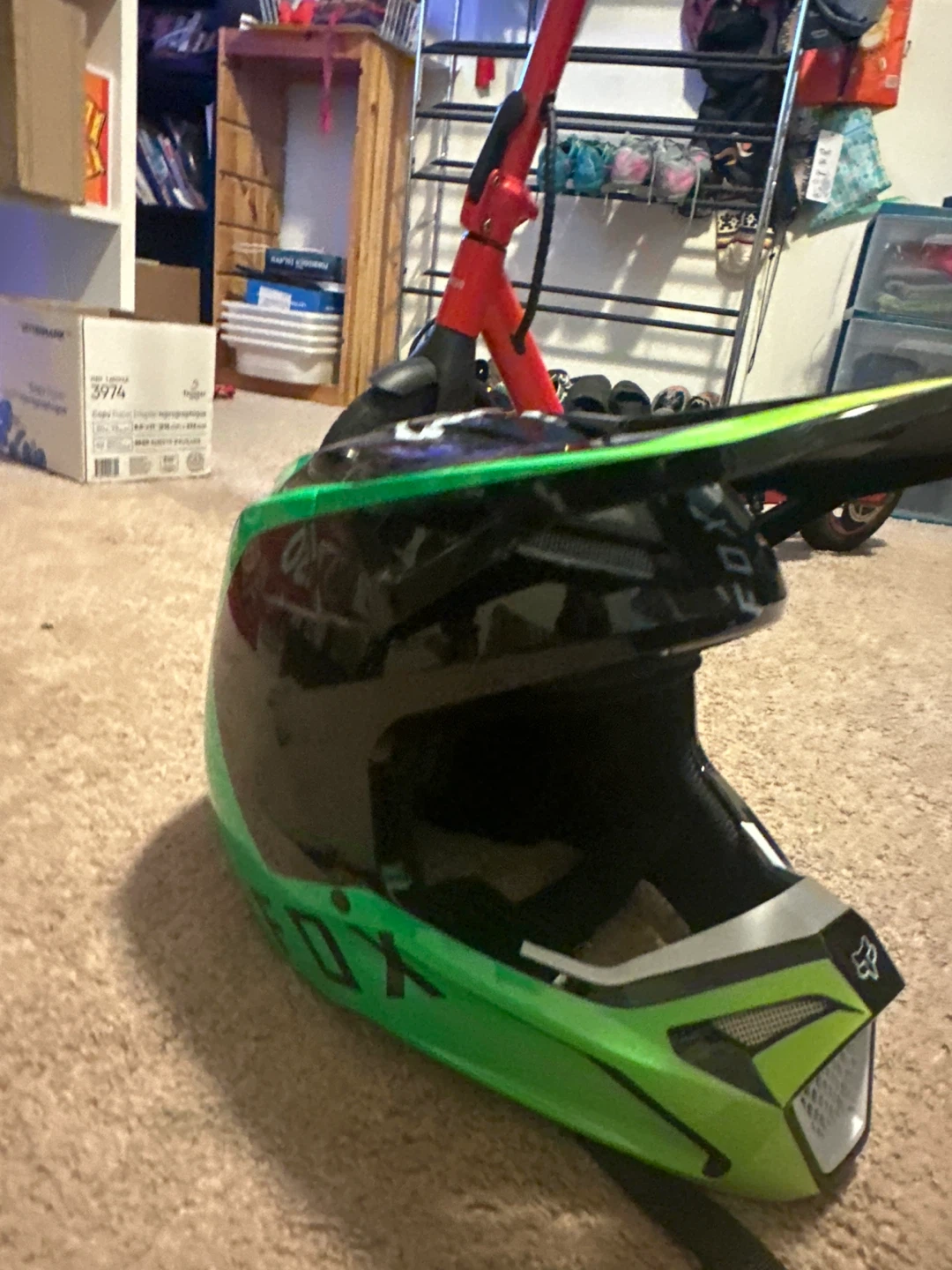 Selling a Fox Racing dirt bike helmet in black and green! It's a size XL and in good condition. Perfect for hitting the trails or the track!