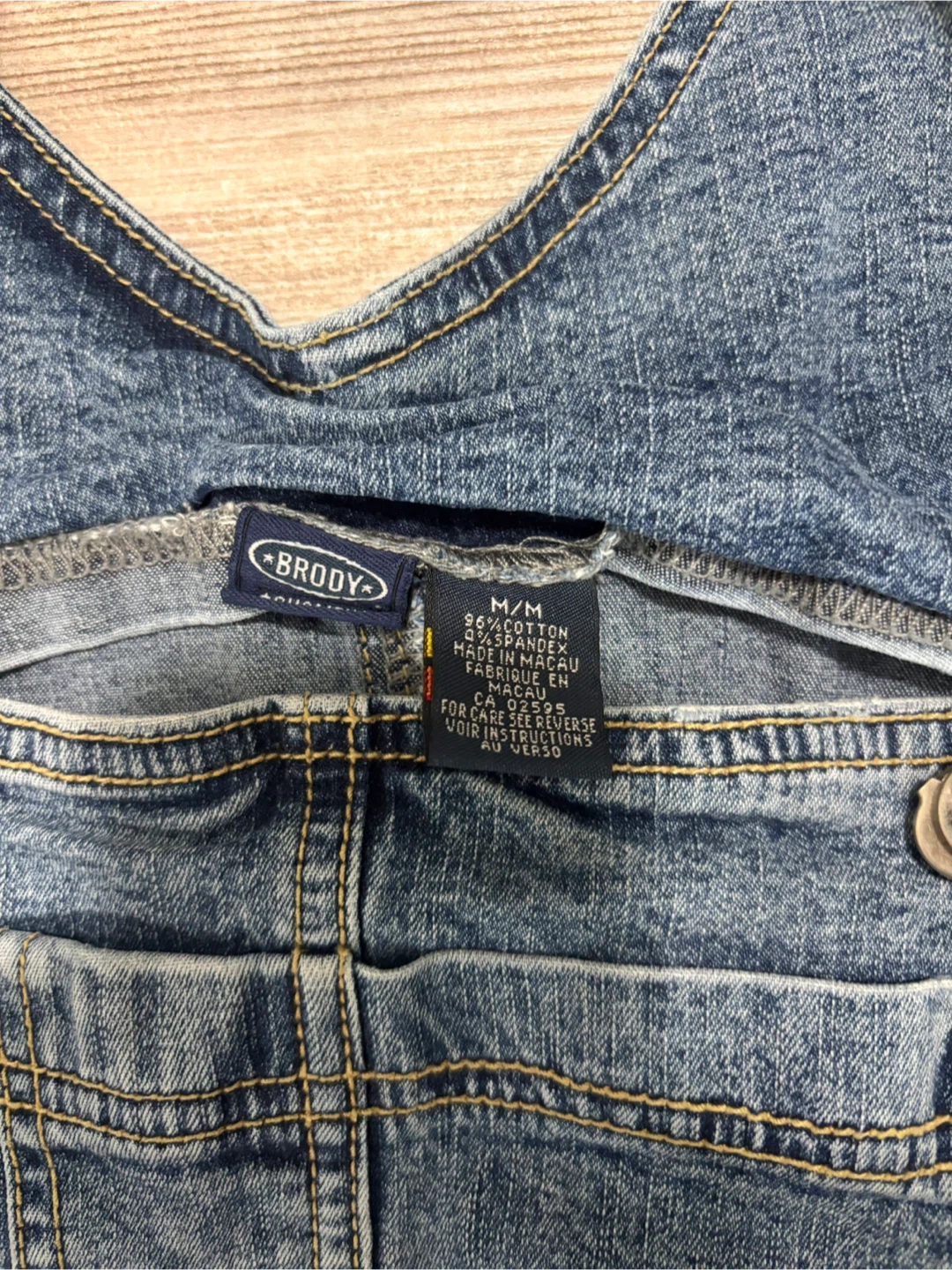 This Brody denim overall dress is a size medium. It's made of 98% cotton and 2% spandex. This dress is great for casual wear!
