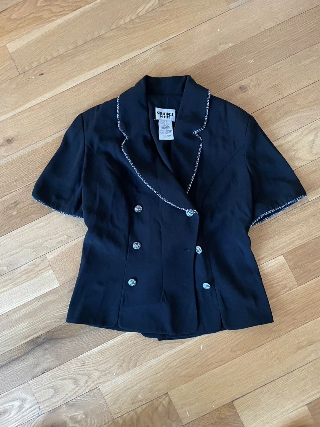 Studio I Petite black blazer with short sleeves and a double-breasted closure. It features decorative trim along the collar and sleeve cuffs. The blazer has silver-toned buttons.
