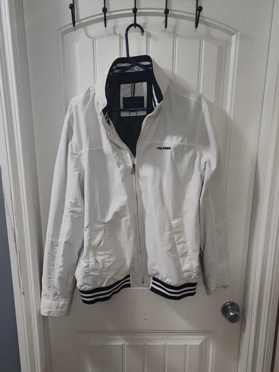 Selling a Tommy Hilfiger jacket in white. It's in great condition and would be perfect for spring or fall. The jacket features a zipper closure and a striped ribbed hem. It is a lightweight jacket.