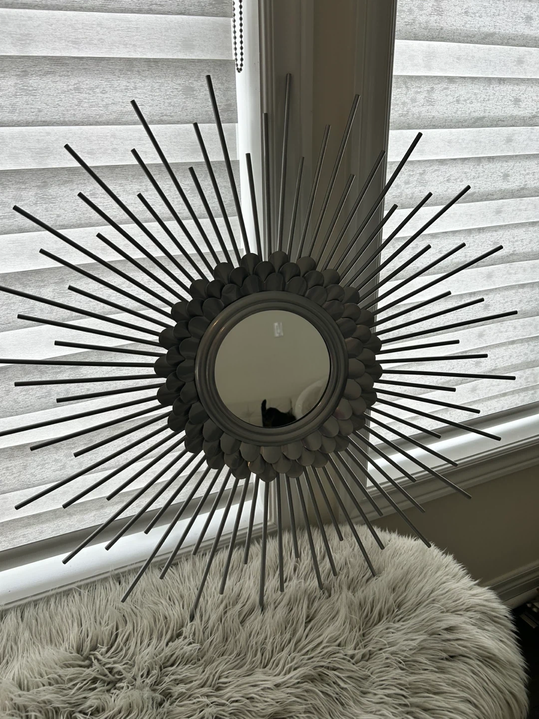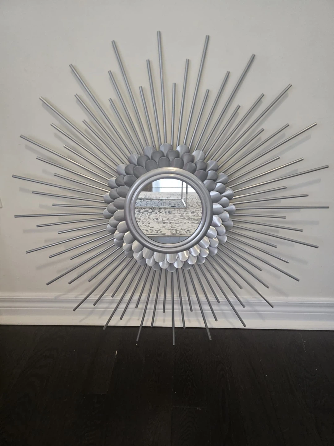 This decorative sunburst mirror adds a modern flair to any room. It's crafted with a metal frame and a central reflective glass. A striking piece that catches the eye!