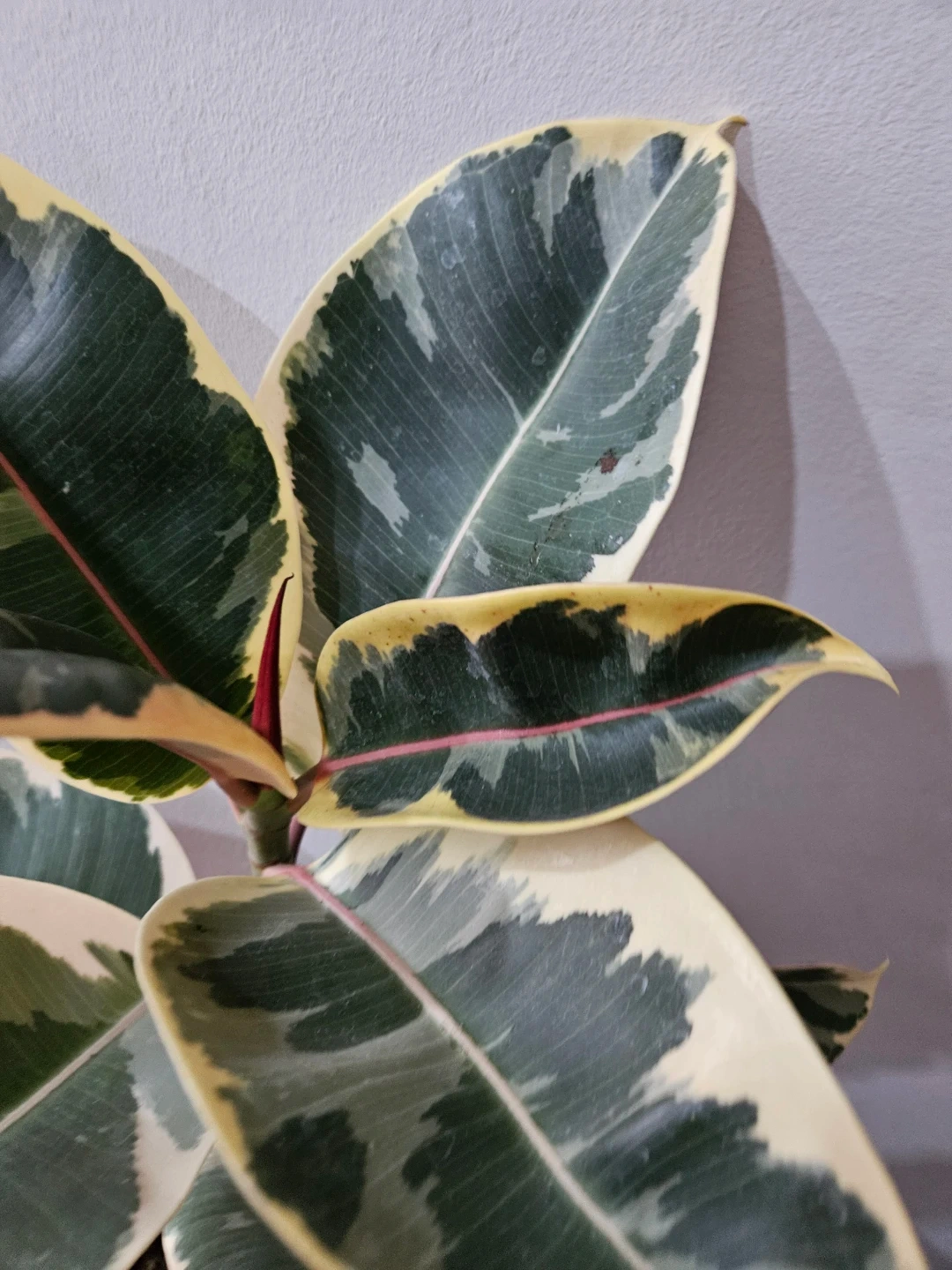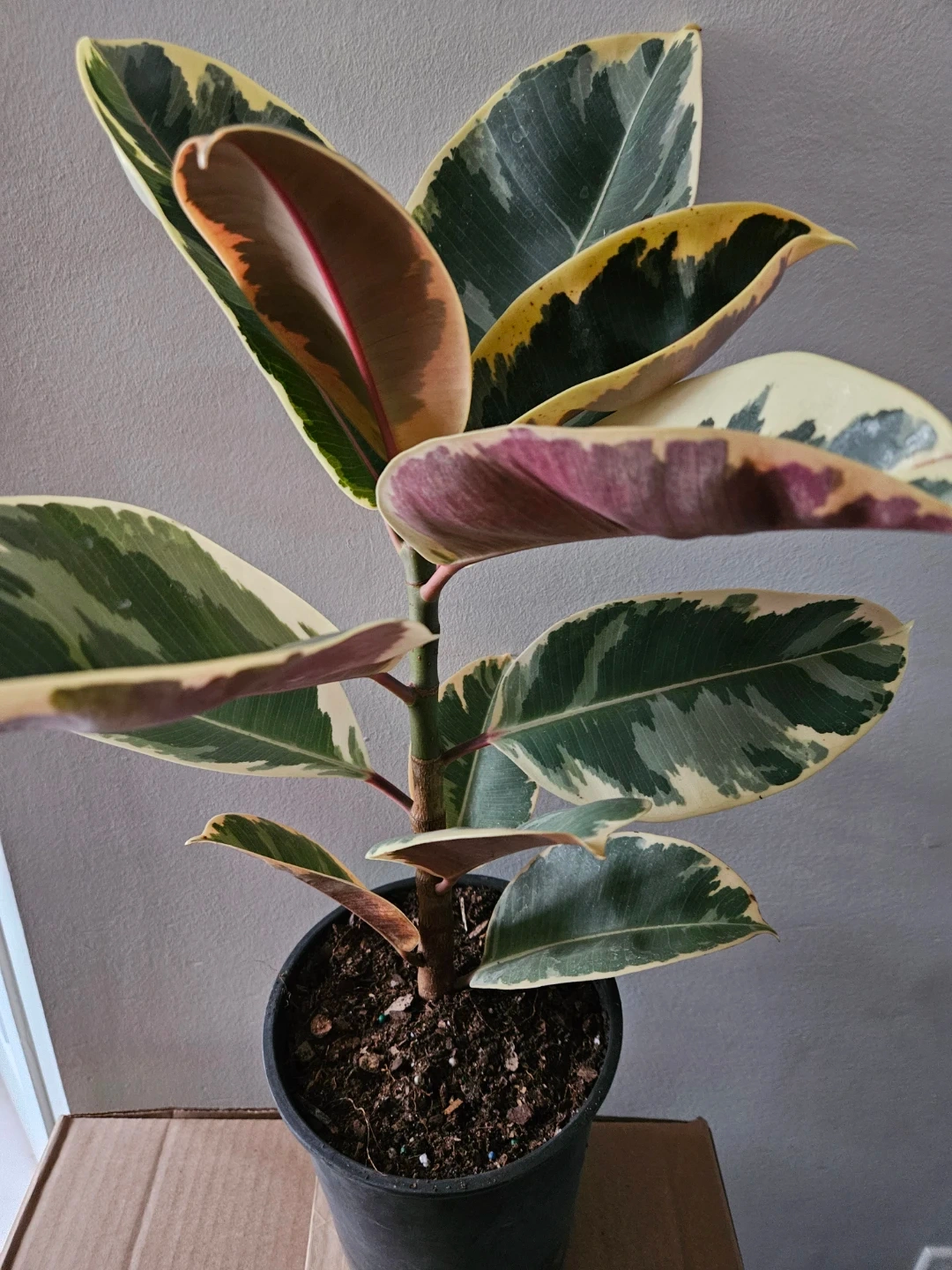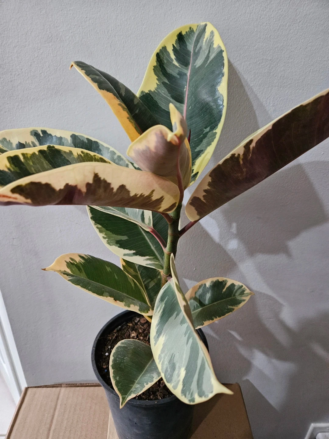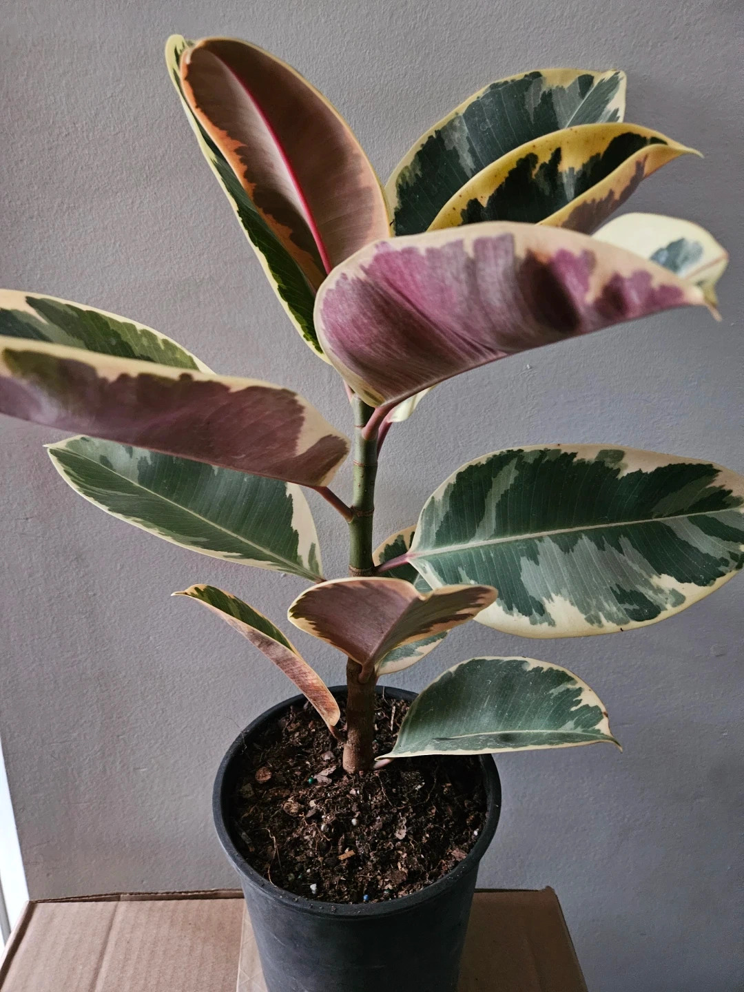 Beautiful Ficus Elastica Burgundy plant with tricolour leaves. This live plant comes in a black nursery pot. It's a great addition to any indoor space, adding a touch of greenery. The plant is healthy and well-established.