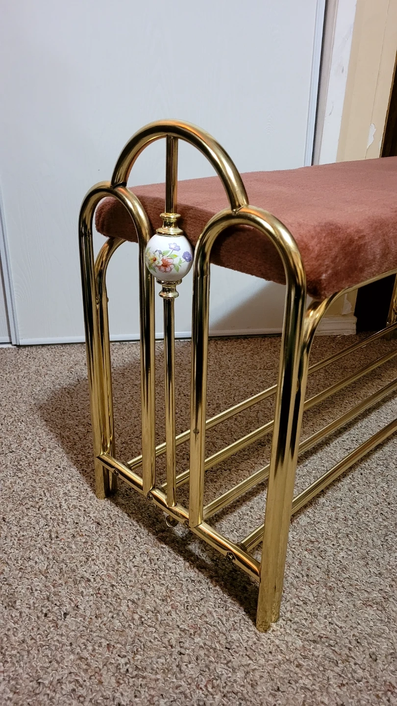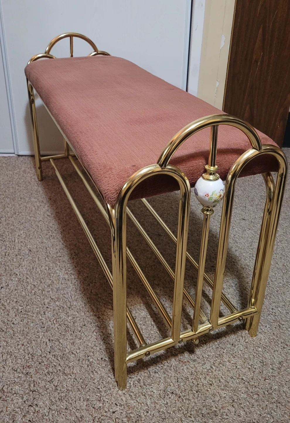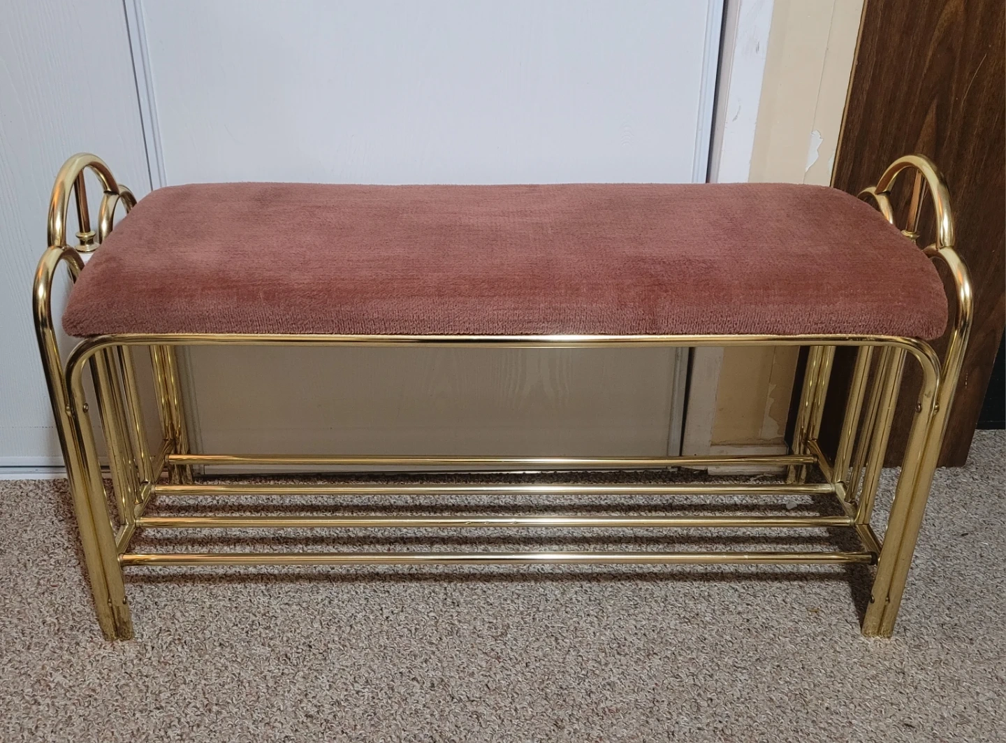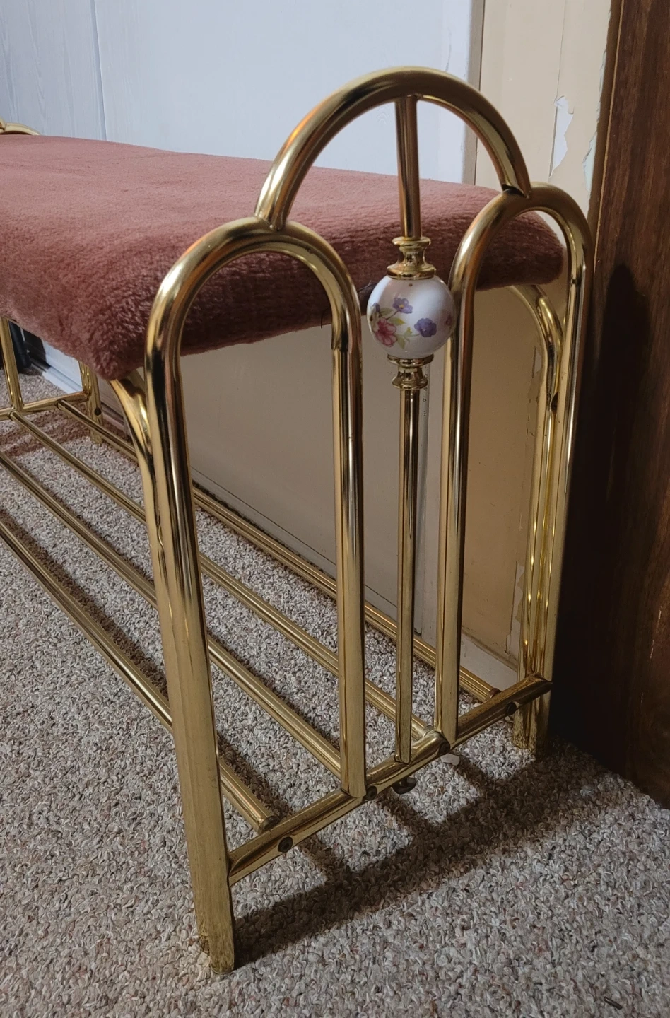 Vintage brass bench with upholstered seat and shoe storage underneath. In great condition. Quite comfy!