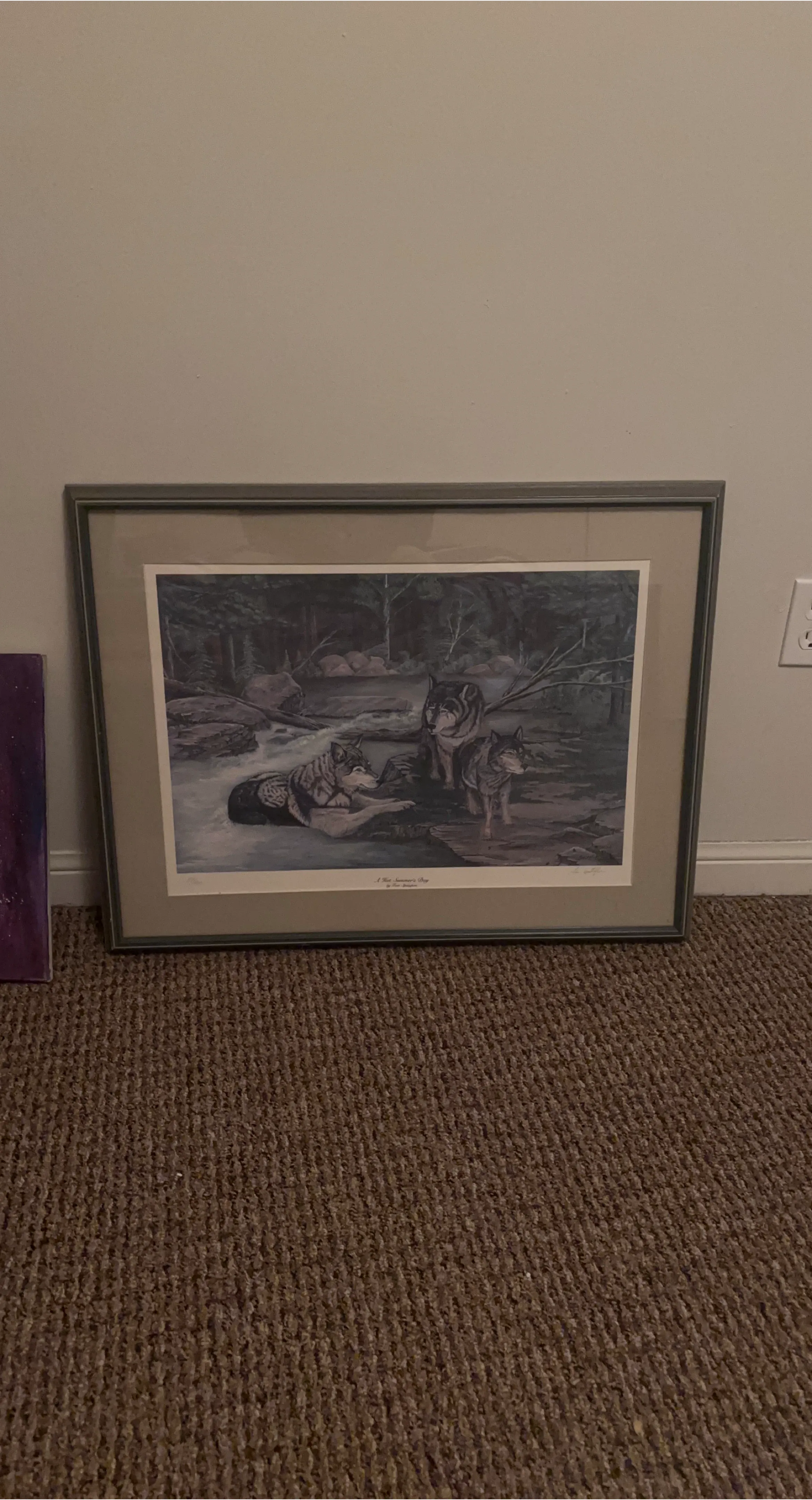 This framed print depicts a pack of wolves by a stream in a forest setting. The artwork is titled "A Quiet Summer's Day" and is signed by the artist, Tom Hinchliffe. It's presented in a grey frame with a neutral matting.