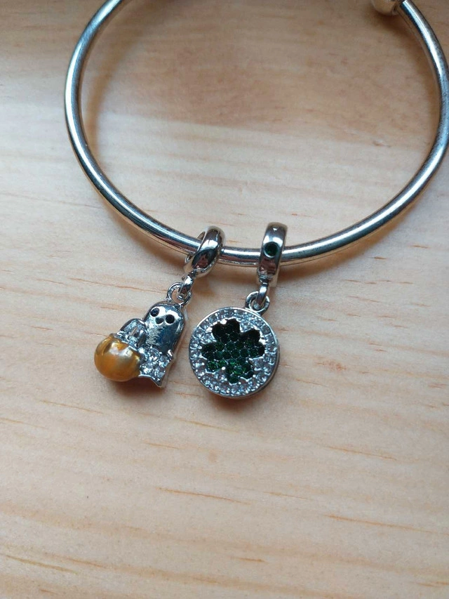 15Ghost with trick or treat pumpkin basket and Clover Bracelet Charms. $10 each. Not real Pandora charms but are a beautiful imitation and are good quality. Fits most bracelets. **Bracelet NOT for sale** Pick up near Banwell and the Expressway.