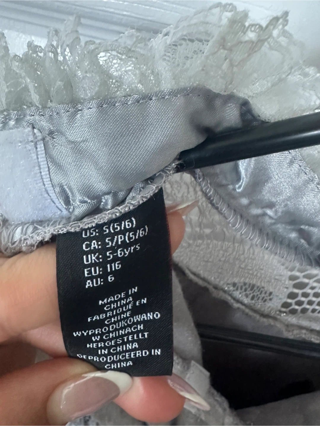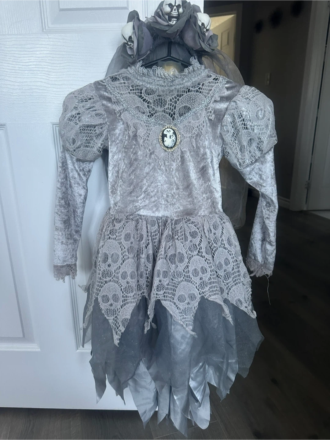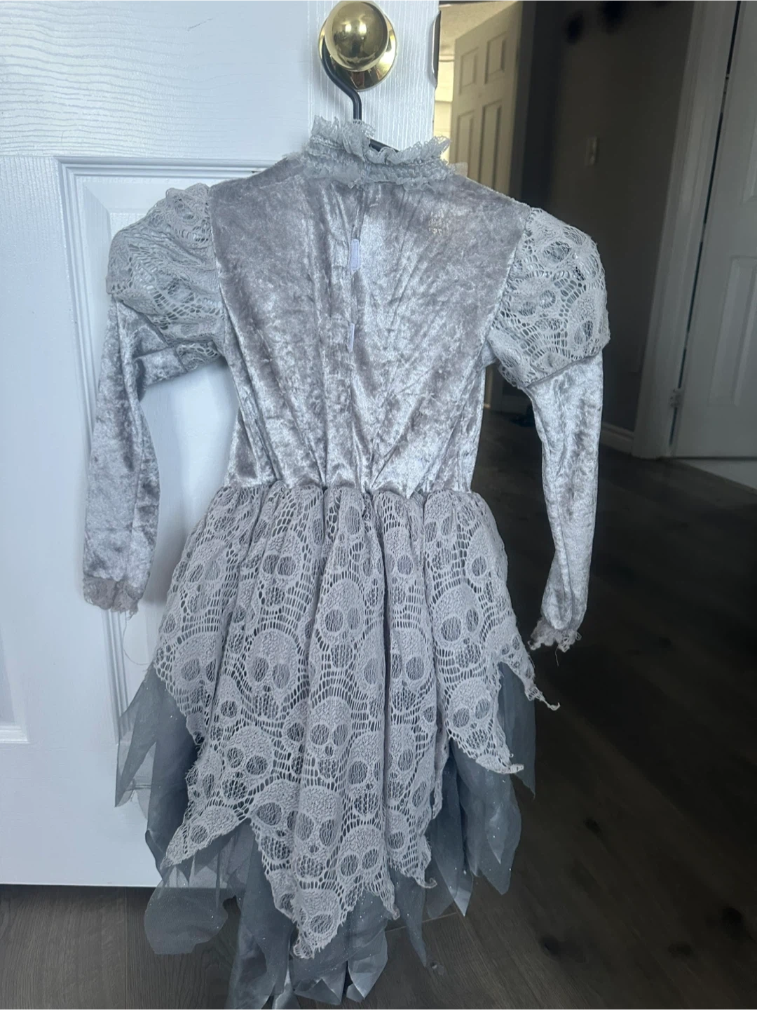 10Selling a gently used ghost bride costume, perfect for Halloween or dress-up! The size is 5/6, suitable for kids aged 5-6 years. It features a grey and white lace design with skull accents. The costume is in great condition and ready for a new home!