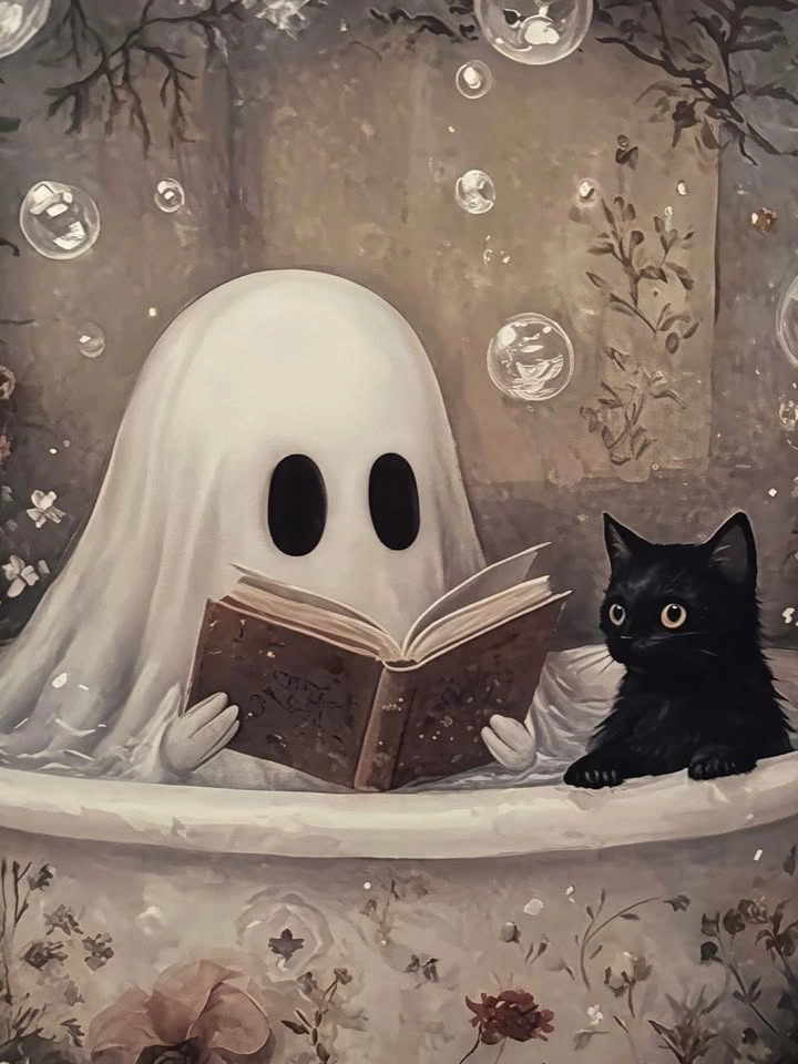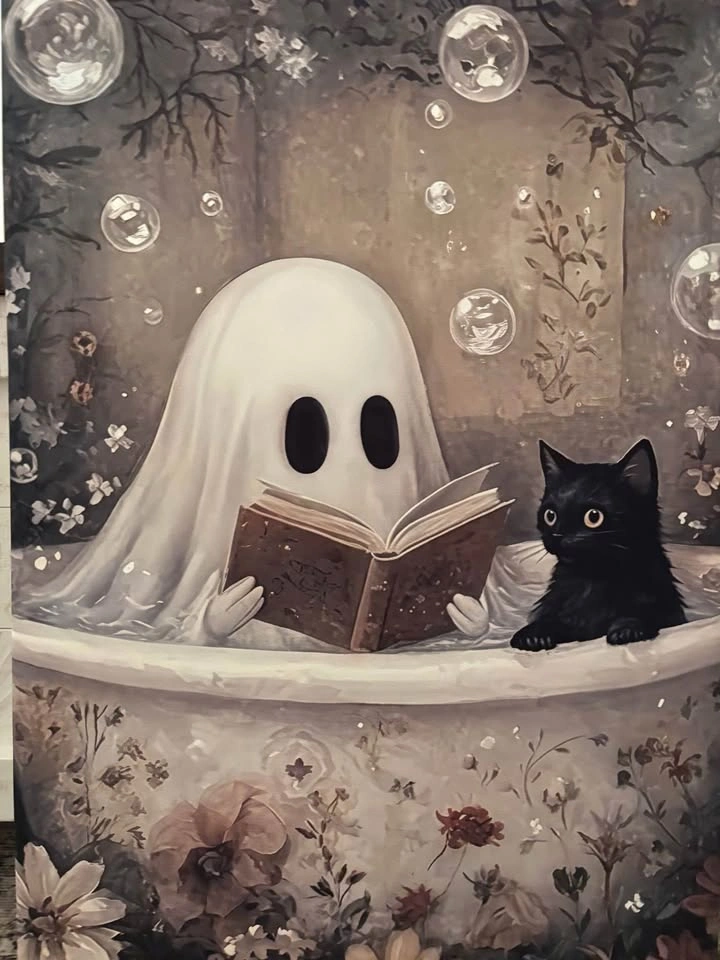 Ghost & Cat In Bathtub Canvas Wall Art-Ready To Hang
