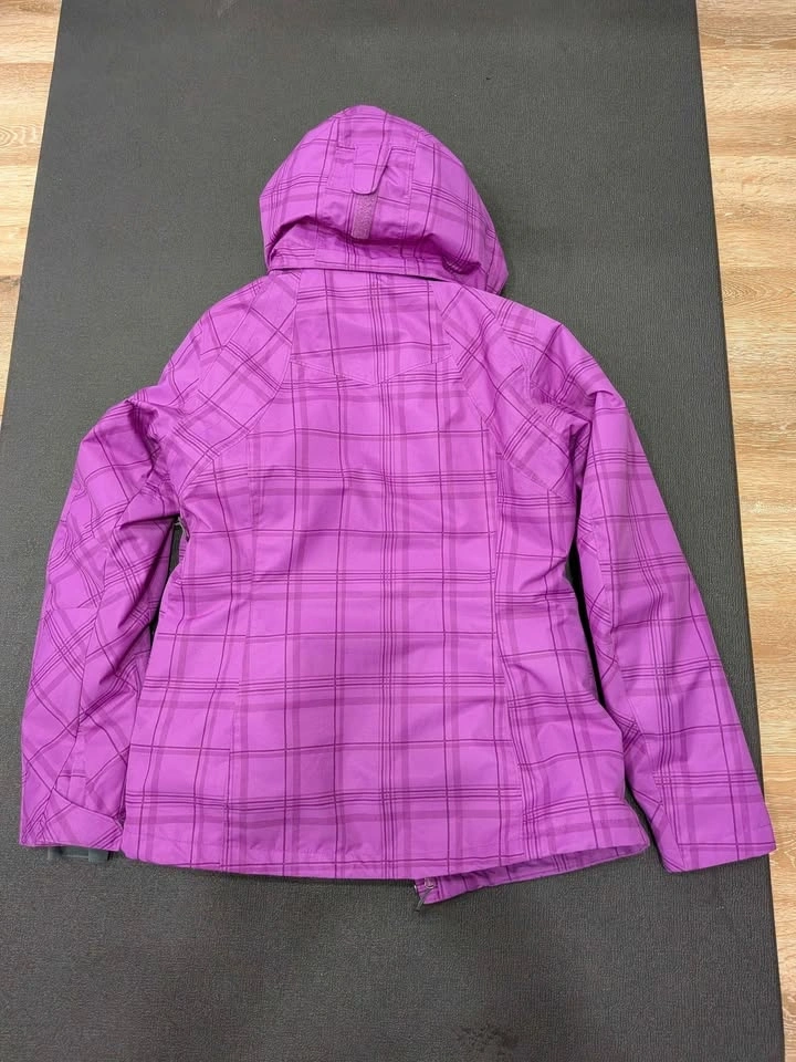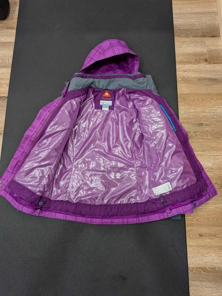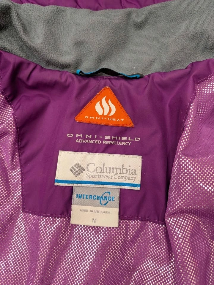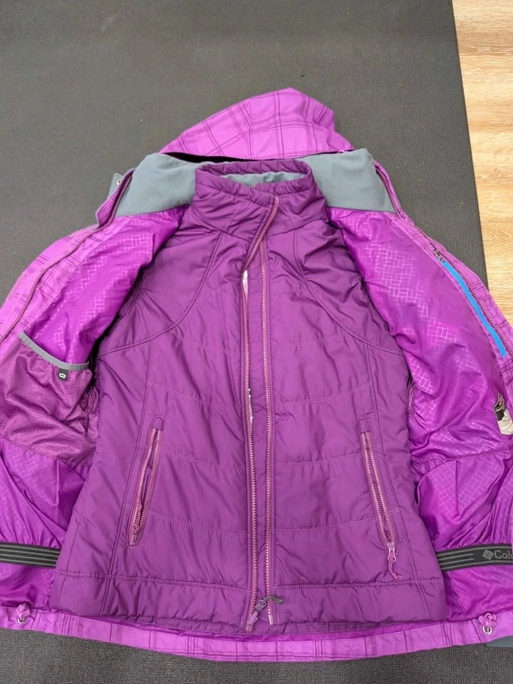 Staying warm never looked so good! This is a Columbia Sportswear Interchange system jacket in a vibrant purple plaid print, size Medium. It features Columbia's Omni-Heat thermal reflective lining and Omni-Shield Advanced Repellency to keep moisture out. This is actually a 2-in-1 system — the inner insulated liner zips out and can be worn separately as a standalone jacket, giving you two jackets in one! Features: Omni-Heat thermal lining, Omni-Shield water repellency, Zip-in Interchange liner (removable inner jacket), Adjustable hood, Multiple zippered pockets, Gray fleece collar lining, Blue accent zipper detail. Great condition — no rips, stains, or broken zippers. Perfect for skiing, hiking, or everyday cold-weather use. No smoking owner. Size: Women's Medium. Color: Purple Plaid. Brand: Columbia Sportswear. Retail price is above $200.