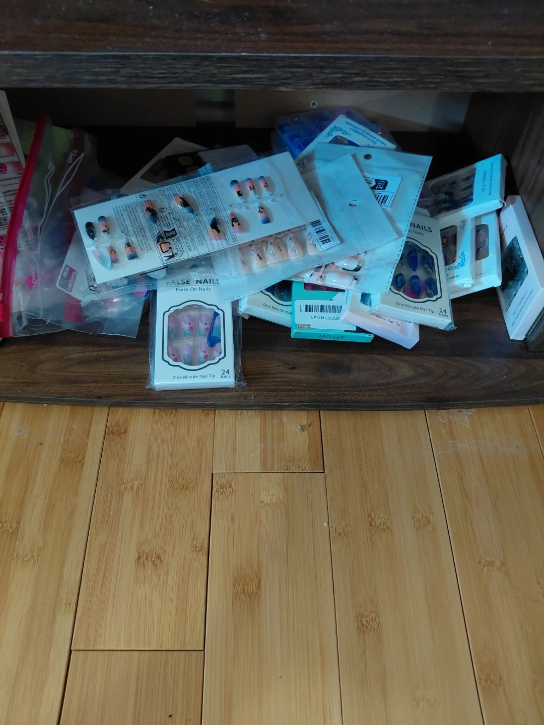 Variety pack of press-on false nails. Includes multiple styles and designs. Each pack contains 24 nails. And a bunch of nail glue. And files.