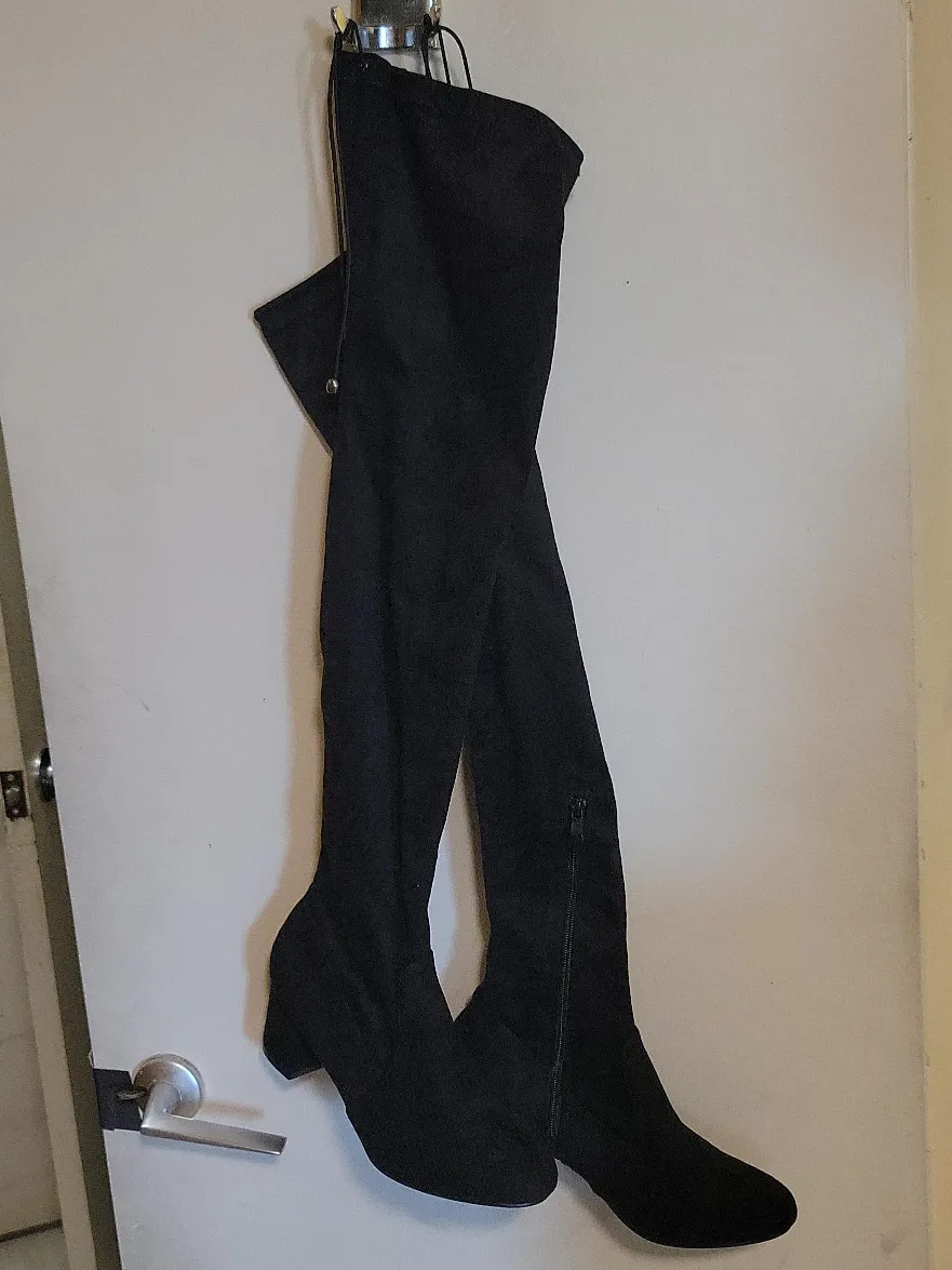 Selling a pair of black thigh high heel boots. They're in great condition and feature a zipper on the side. Perfect for adding a bit of flair to your outfit!