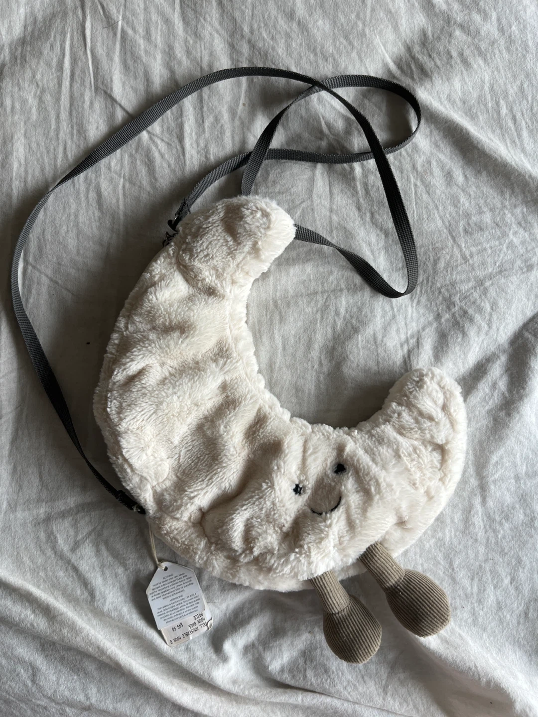 Cream fuzzy moon-shaped bag with a smiley face and dangling legs. It has a zipper closure and an adjustable strap. Perfect for little ones to carry their treasures! Bought for 45$ tax. No low balling on jelly cat. I just dont use it anymore.