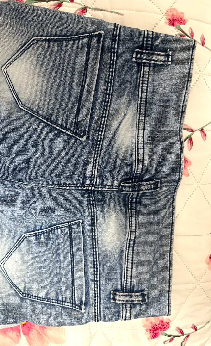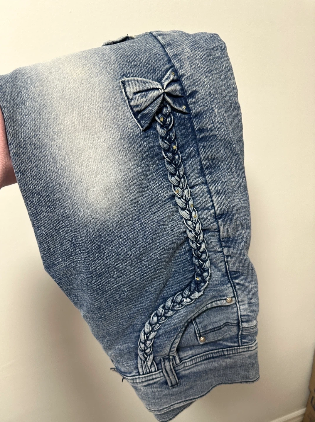 Cute light wash jeans. Has braided denim details with little rhinestones on the front. Also has denim bows with rhinestones on the outer legs. Waist is about 13.5 inches across when laid flat. Inseam is around 26-27 inches. Total length is about 36 inches. Price is negotiable