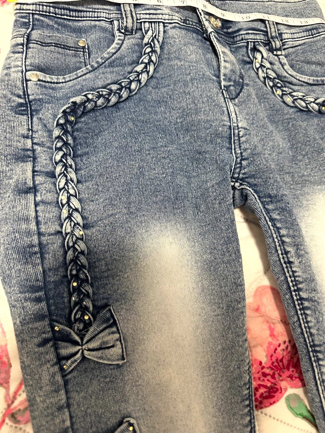 Cute light wash jeans. Has braided denim details with little rhinestones on the front. Also has denim bows with rhinestones on the outer legs. Waist is about 13.5 inches across when laid flat. Inseam is around 26-27 inches. Total length is about 36 inches. Price is negotiable