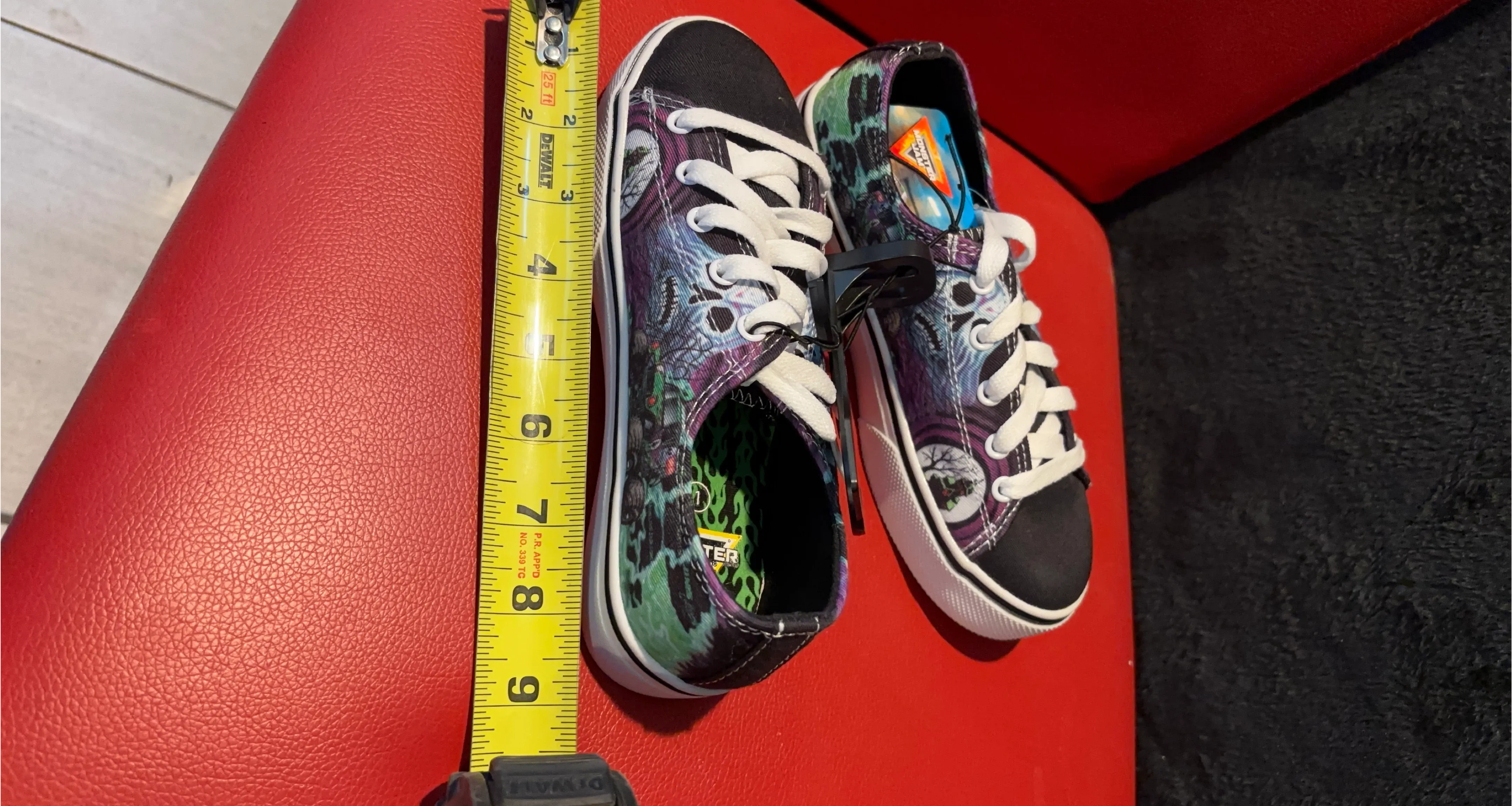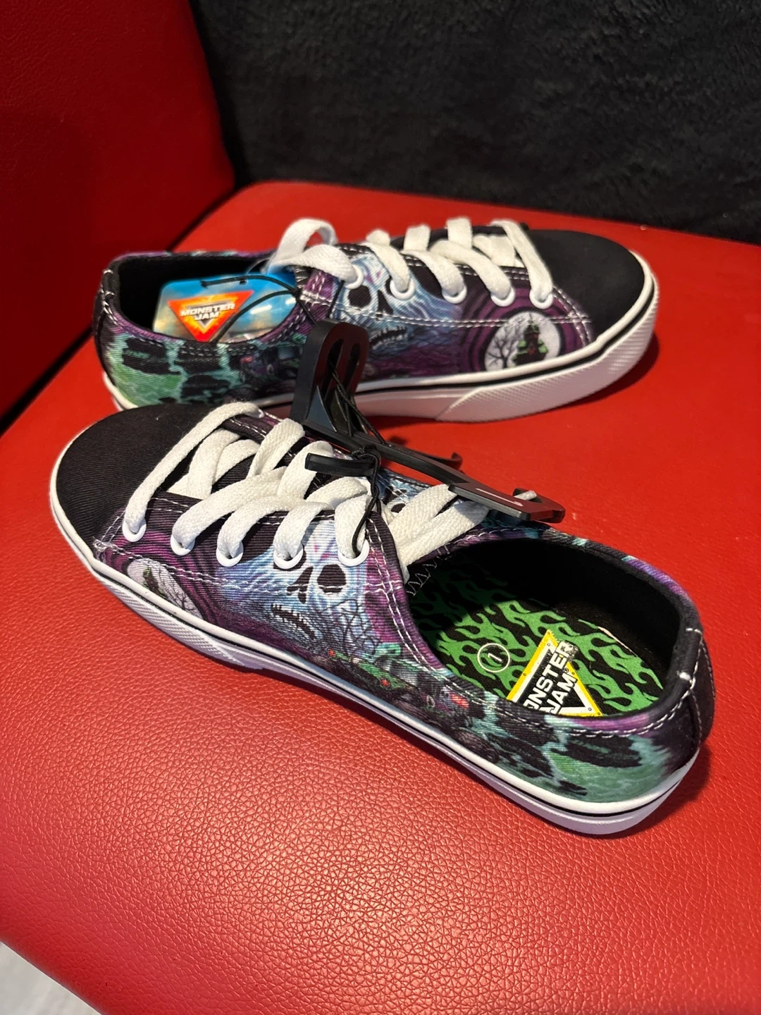 These Monster Jam sneakers feature a spooky, graphic print. They have white laces and black toe caps. Canvas upper with rubber soles.