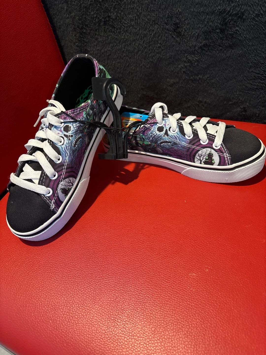These Monster Jam sneakers feature a spooky, graphic print. They have white laces and black toe caps. Canvas upper with rubber soles.