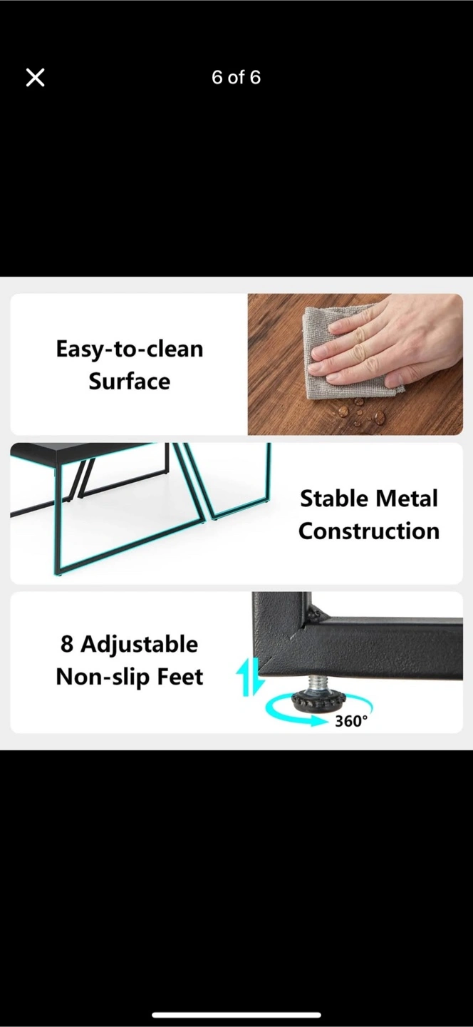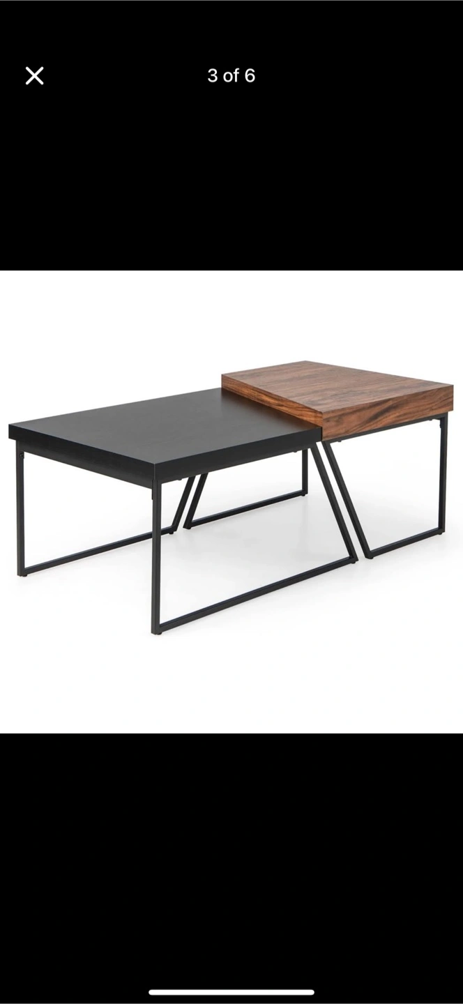 Features a two-tiered design. Upper level made from dark wooden material, lower level in black. Angled, geometric metal legs. This table is ideal for resting a warm cup of tea on a cool evening.