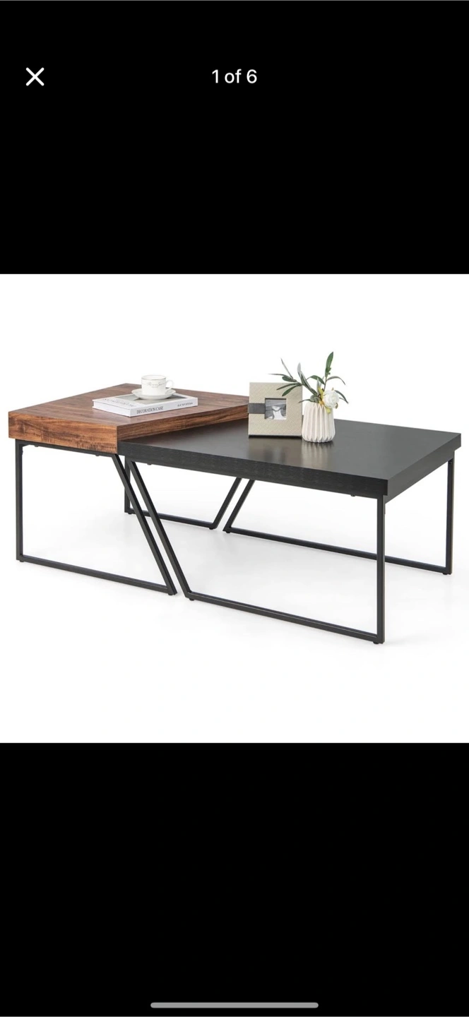 Features a two-tiered design. Upper level made from dark wooden material, lower level in black. Angled, geometric metal legs. This table is ideal for resting a warm cup of tea on a cool evening.