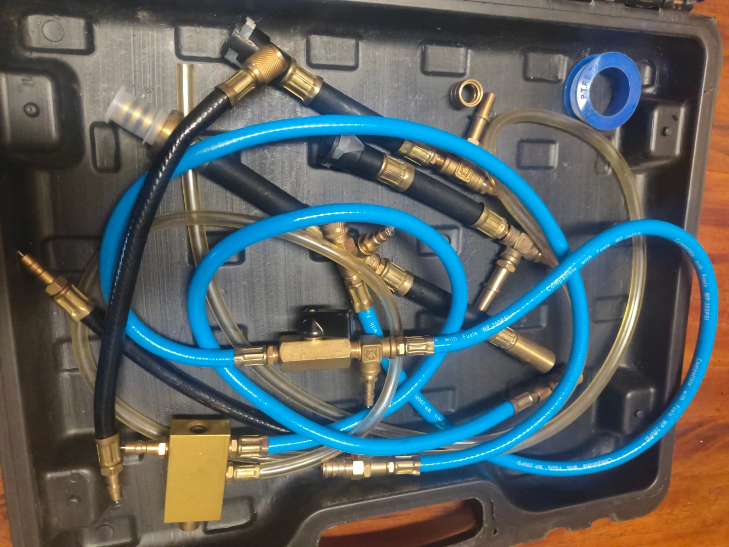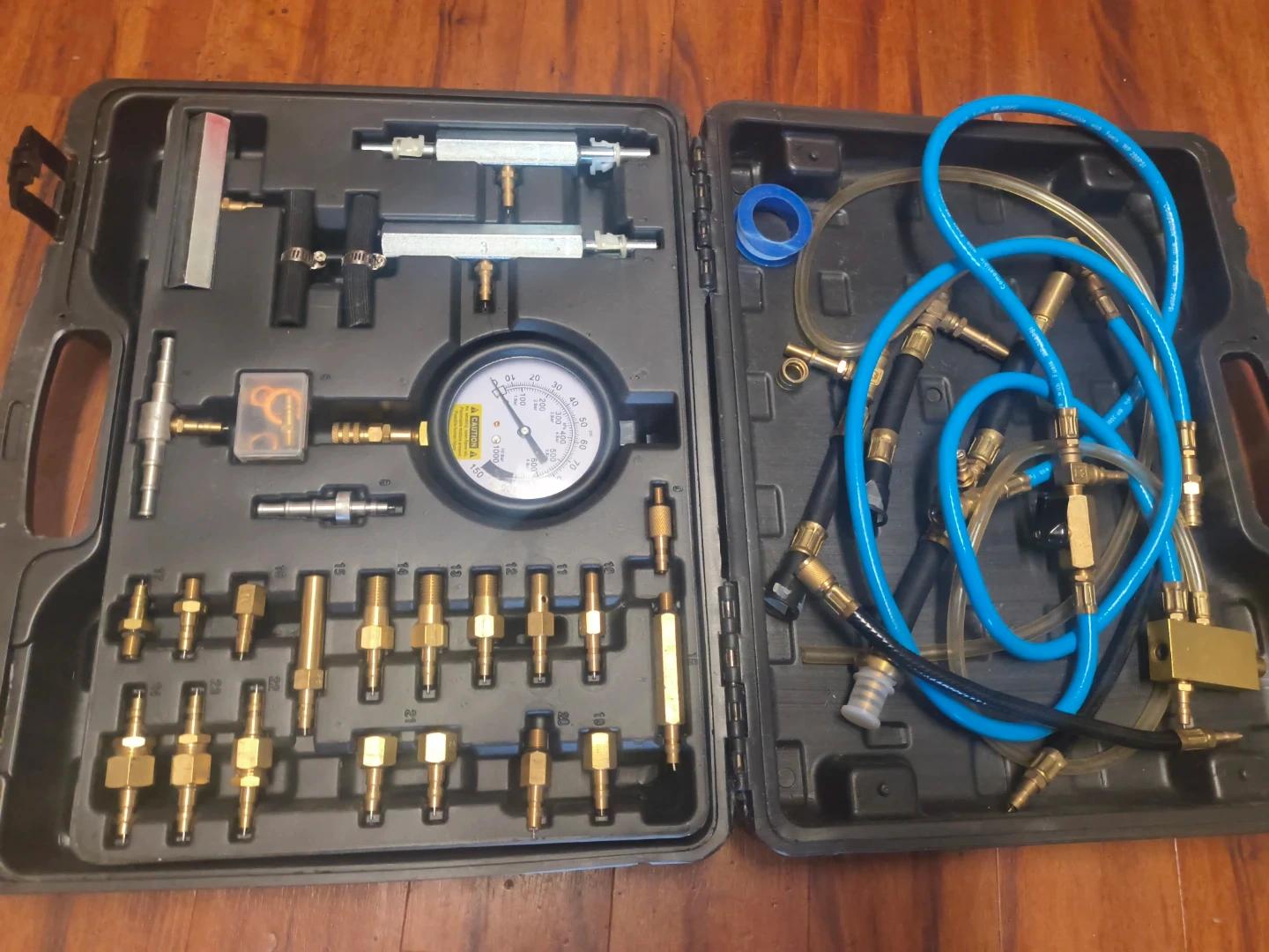 This is a vacuum pump and brake bleeder test kit. It includes a pressure gauge and various adapters. Components are housed in a durable carrying case.