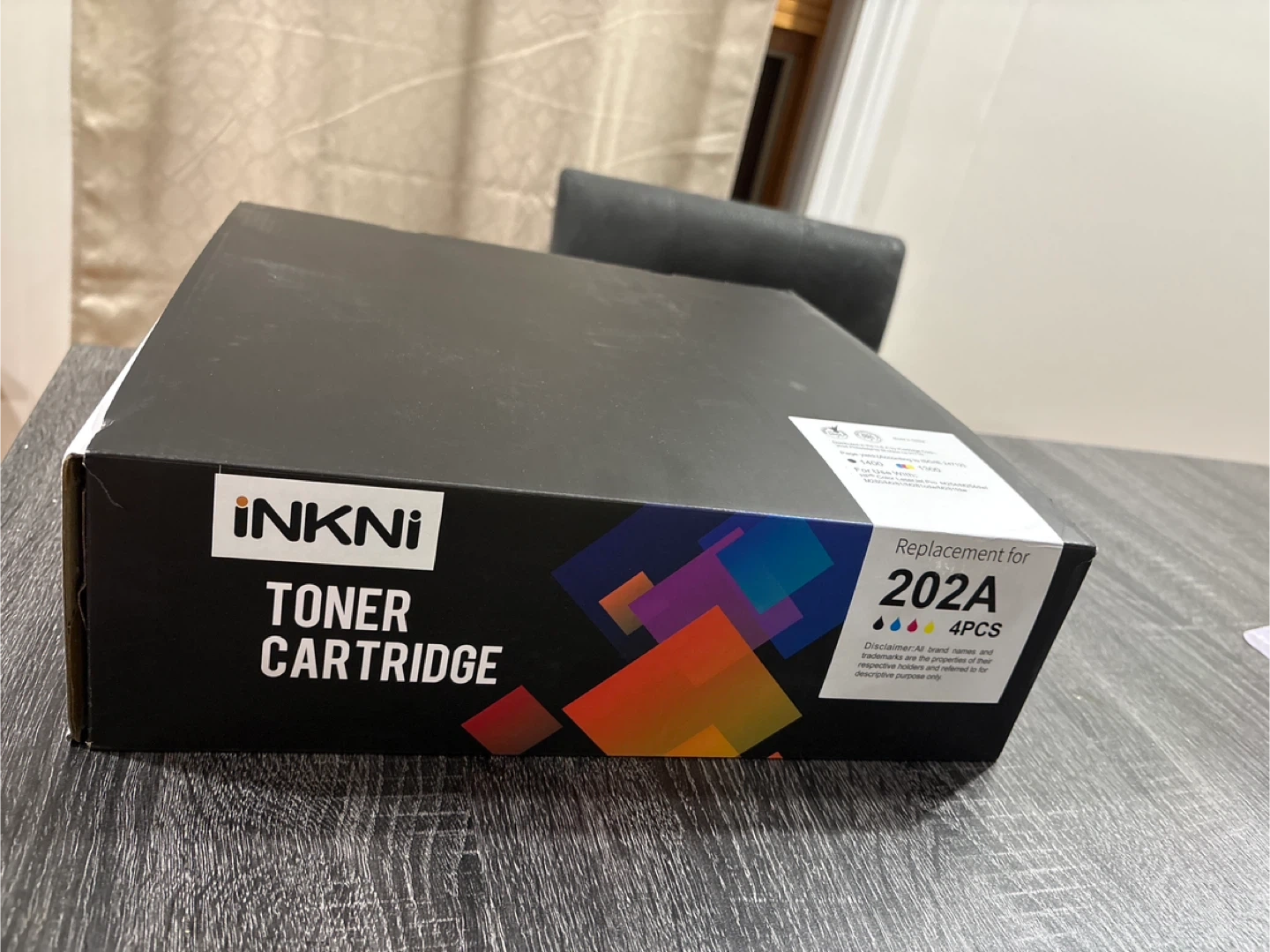 This is a set of 4 INKNI toner cartridges, designed as a replacement for the 202A model. Includes CMYK colors.