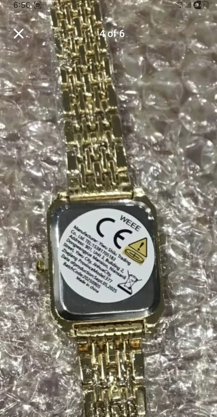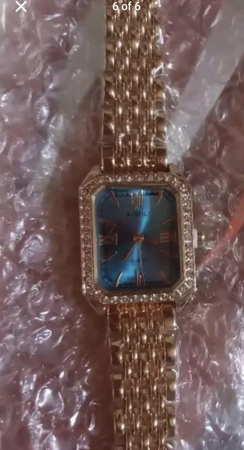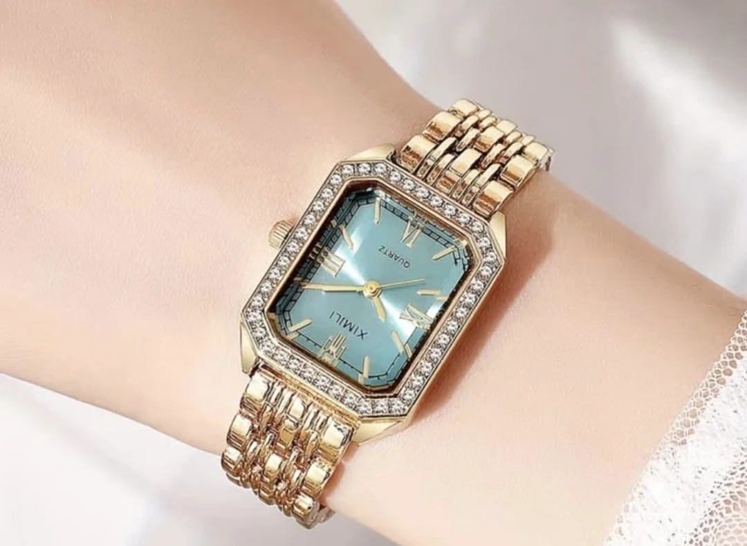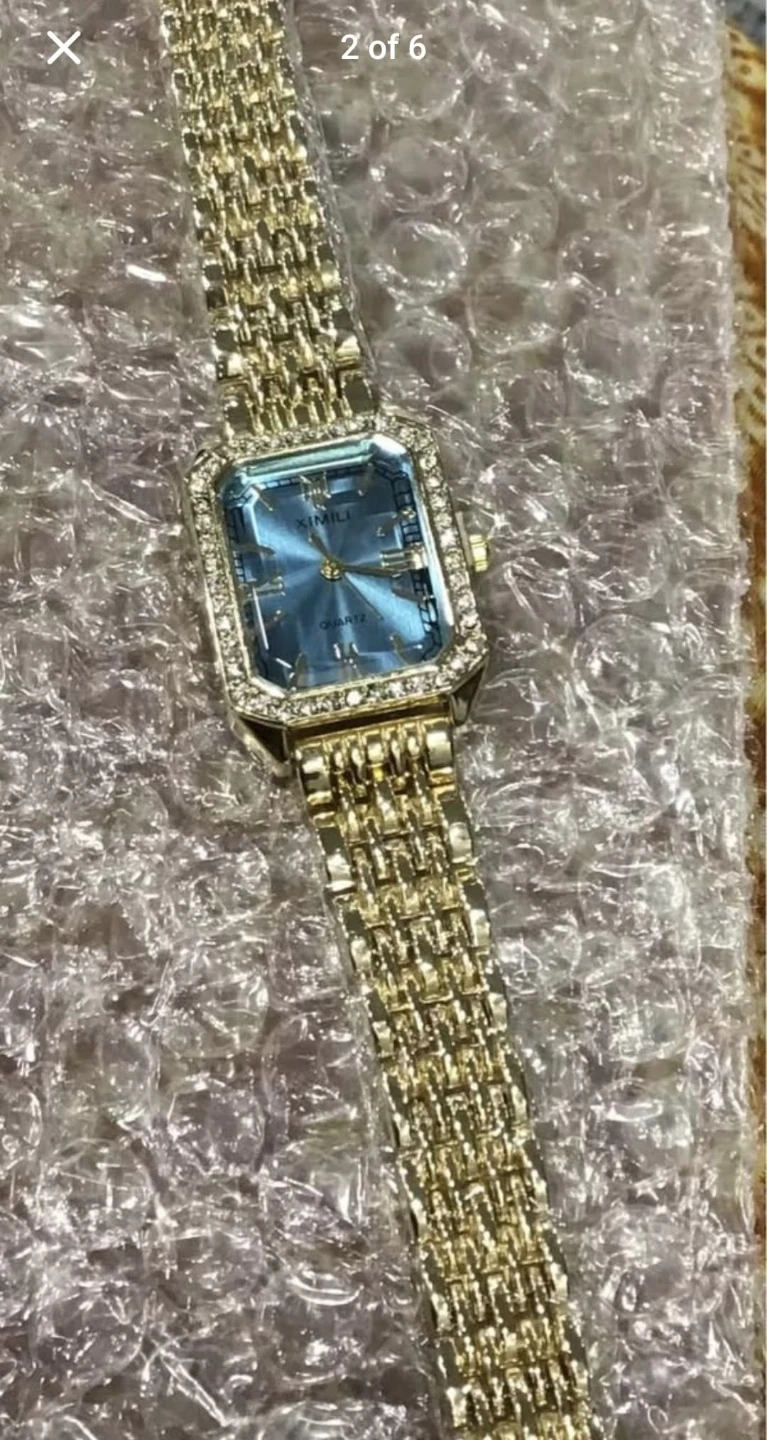 A chic gold-tone wristwatch with a rectangular blue dial and sparkling crystal accents. It's a quartz movement watch, perfect for adding a touch of elegance to any outfit. This watch is suitable for daily wear or special occasions.