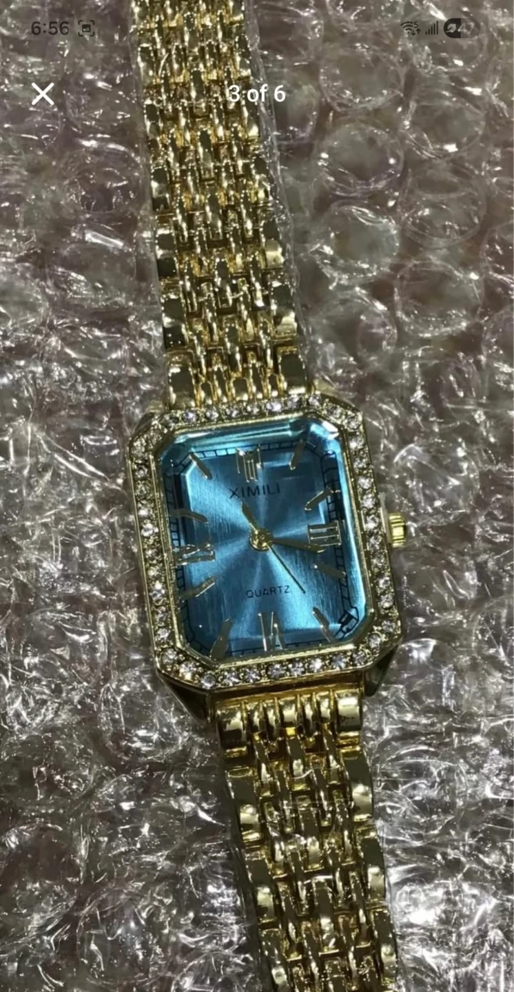 A chic gold-tone wristwatch with a rectangular blue dial and sparkling crystal accents. It's a quartz movement watch, perfect for adding a touch of elegance to any outfit. This watch is suitable for daily wear or special occasions.