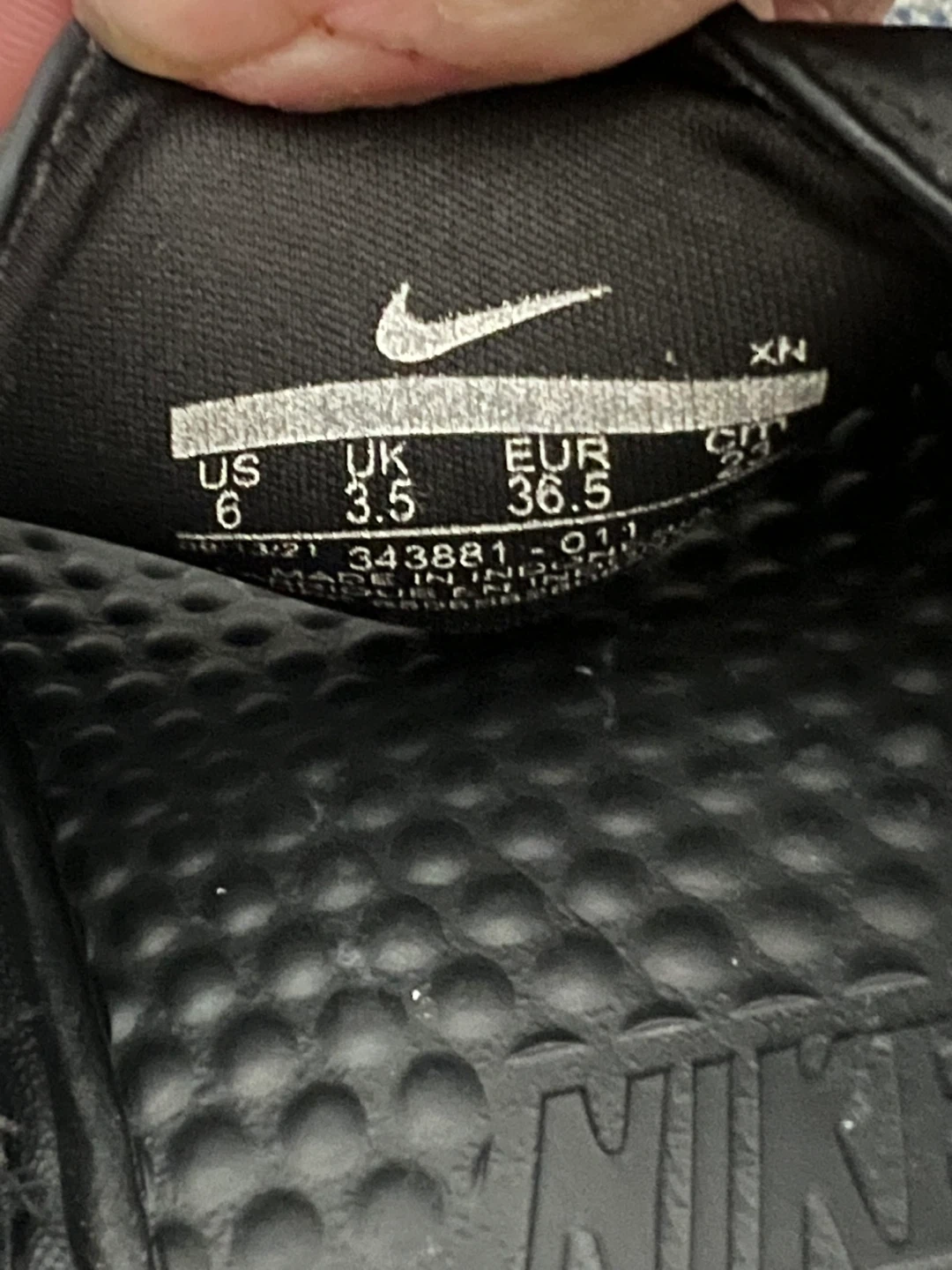 Classic Nike Benassi slides in black. These slides feature EVA foam for comfortable wear and better grip and Neoprene Material with imprinted textiles to keep the design more sophisticated than before. Size US 6, UK 3.5, EUR 36.5.