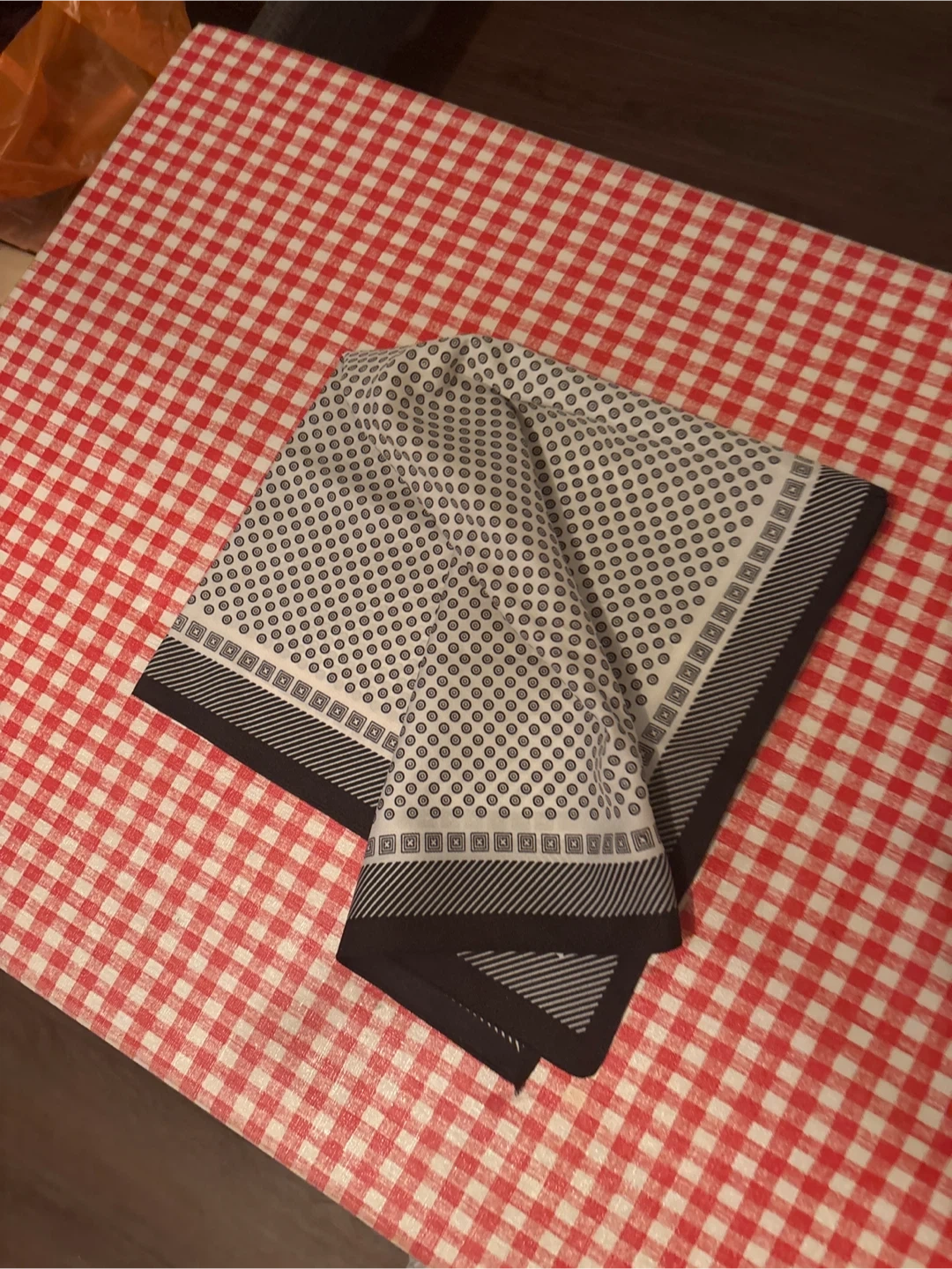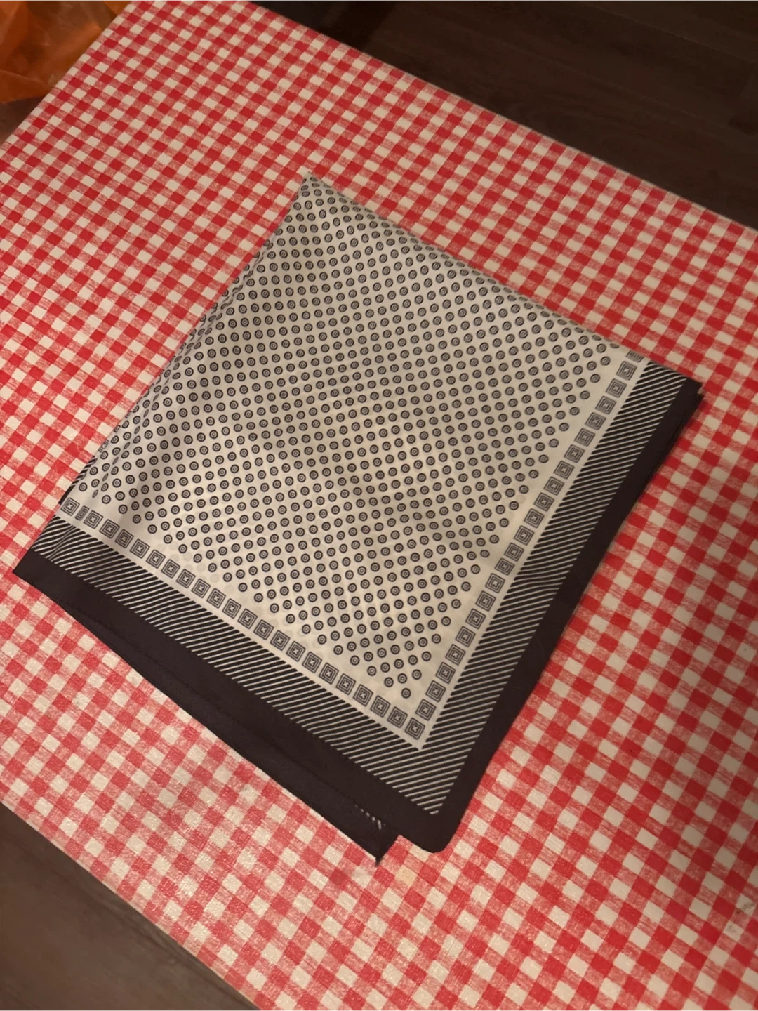 A classic pocket square scarf with a micro dot pattern and a geometric border. Adds a touch of class to any suit or jacket. Great for formal events or everyday wear.