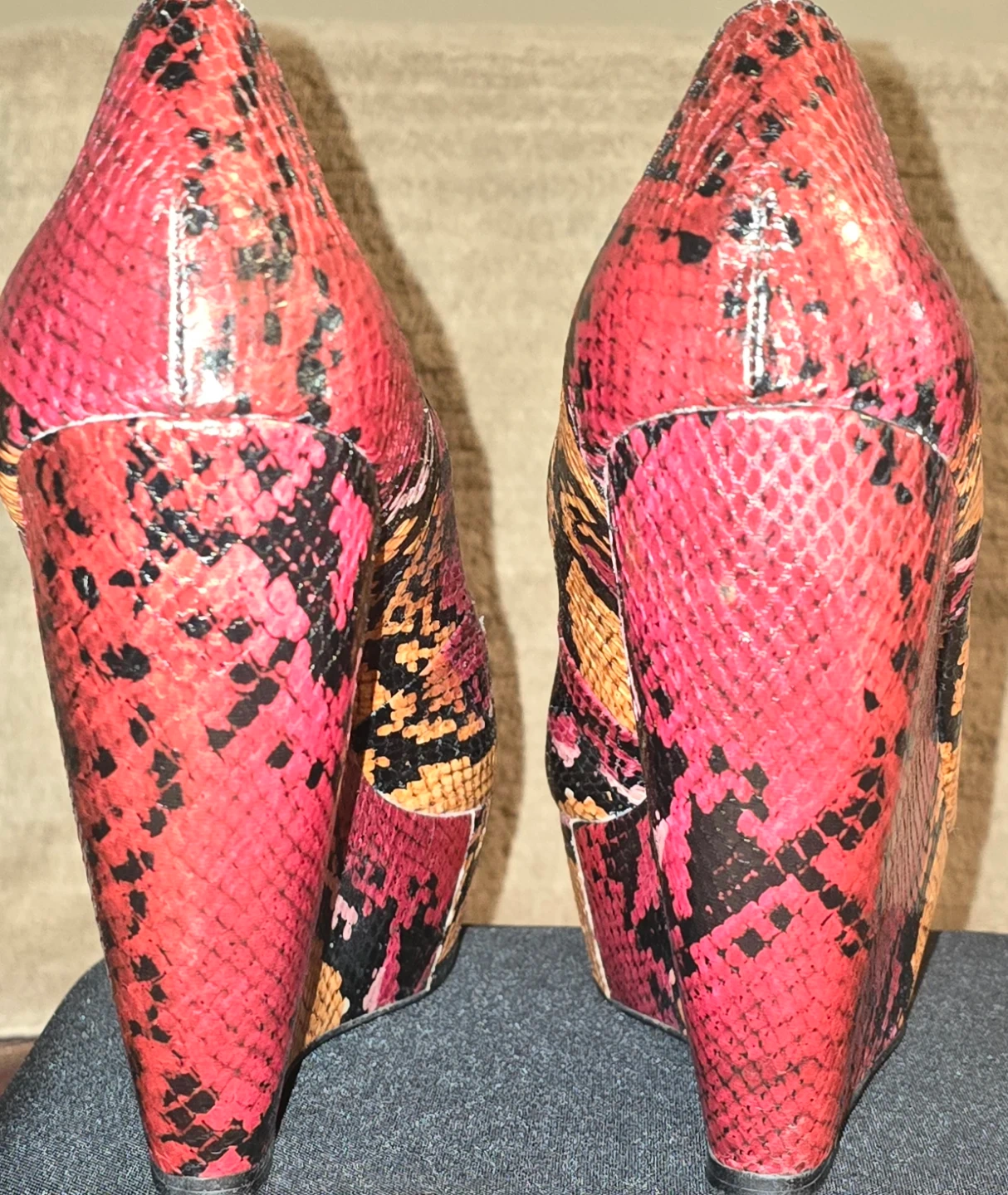 These ALDO wedge heels feature a striking red snake print design. They have a platform front and a bold wedge heel, perfect for adding flair to an outfit. A stylish choice for evening wear or a night out! Slightly worn, still in great condition.