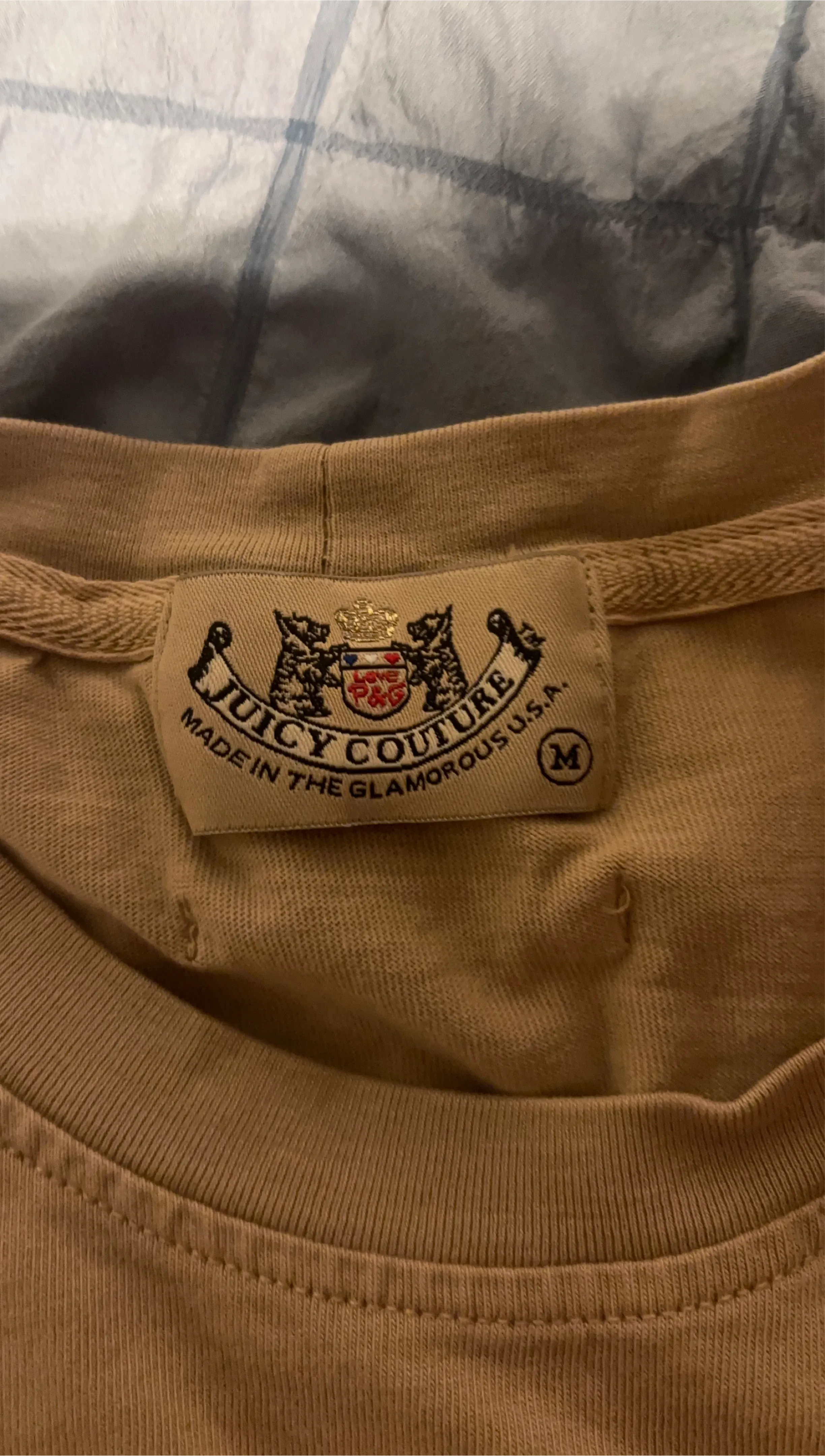 Juicy Couture short-sleeve crew neck t-shirt. Size medium. Made in the USA. Tan colour.