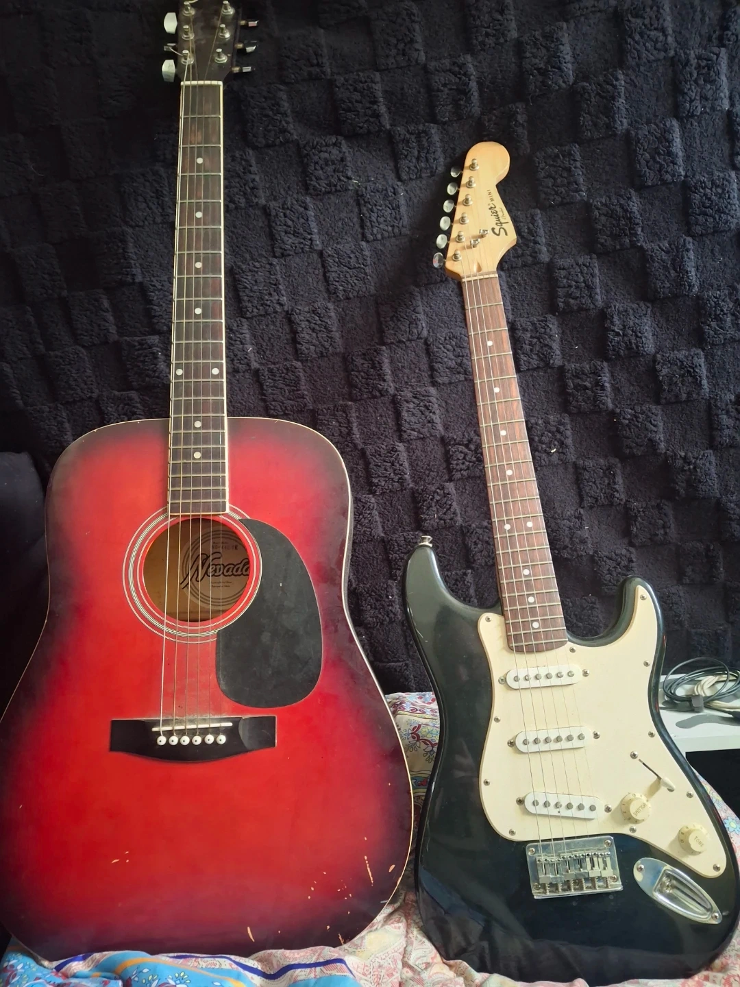 Black Fender Squier Mini electric guitar with a cream pickguard. Bought new in 2004 and well loved since. Plays well and holds a tune. Its exactly like a normal size strat but is 3/4 size. Perfect for kids or small adults. Very fun to play. Acoustic shown for scale and not for sale. $100 or best offer.