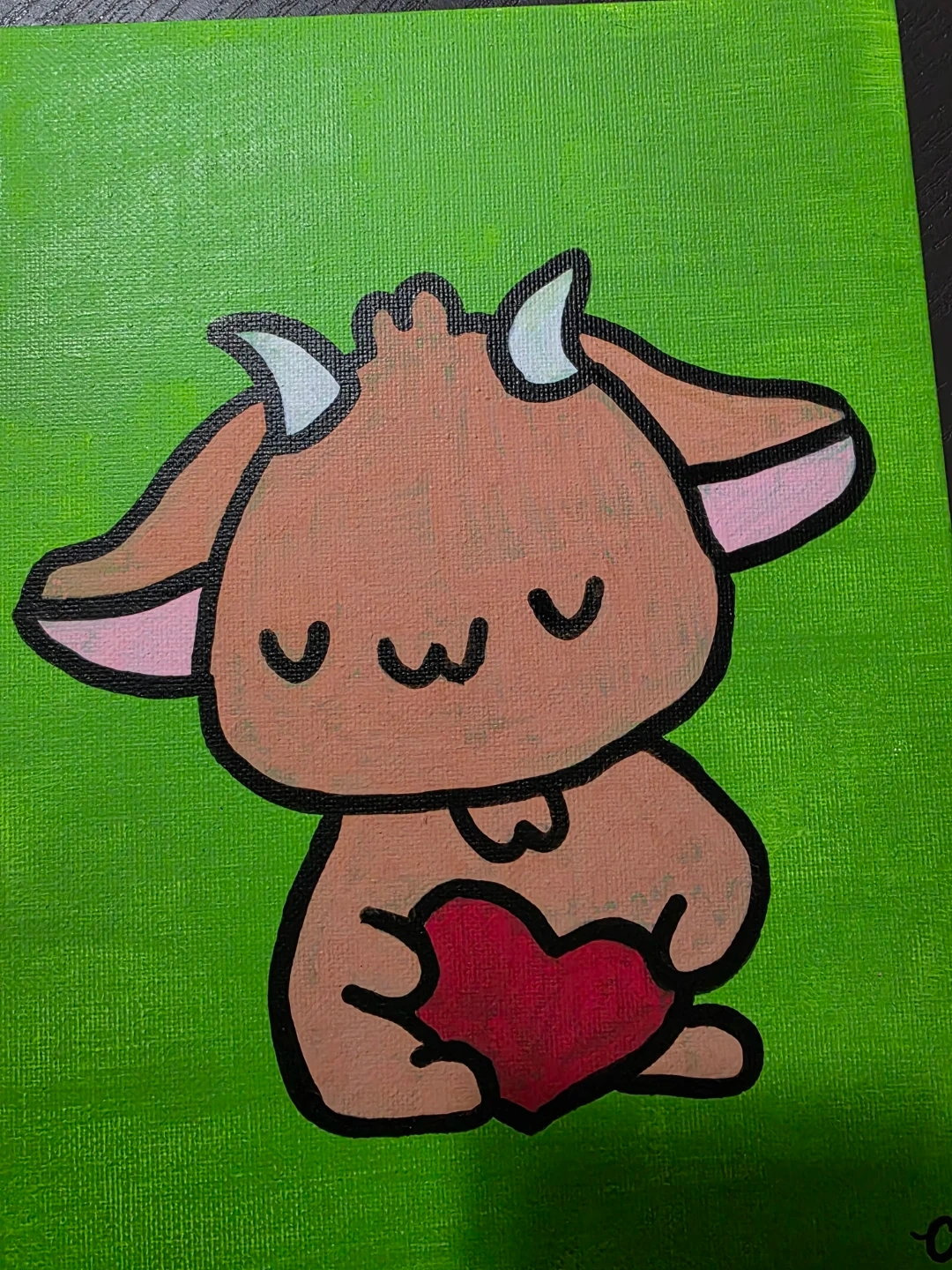 A sweet acrylic painting featuring a cartoon-style goat holding a red heart. The vibrant green background makes the artwork pop! It's a charming piece for any animal lover.