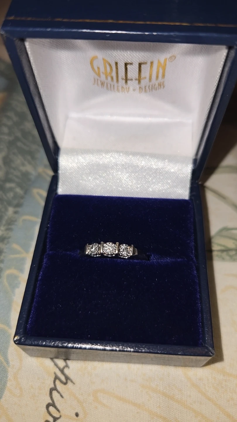 A classic .10 three-stone diamond ring from Griffin Jewellery. 10kt white gold, It comes in its original Griffin Jewellery box. This ring would make a lovely gift or a special treat for yourself! Retail price is 600$
