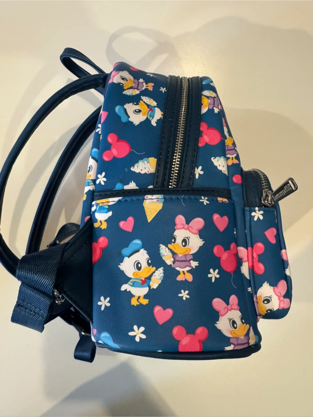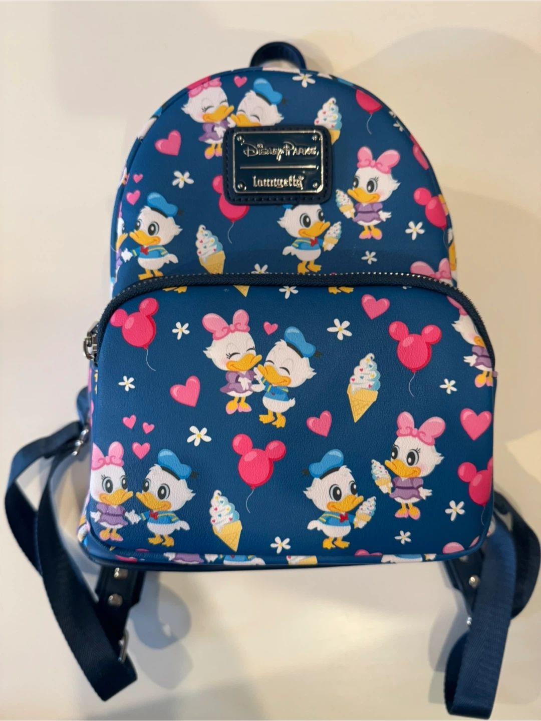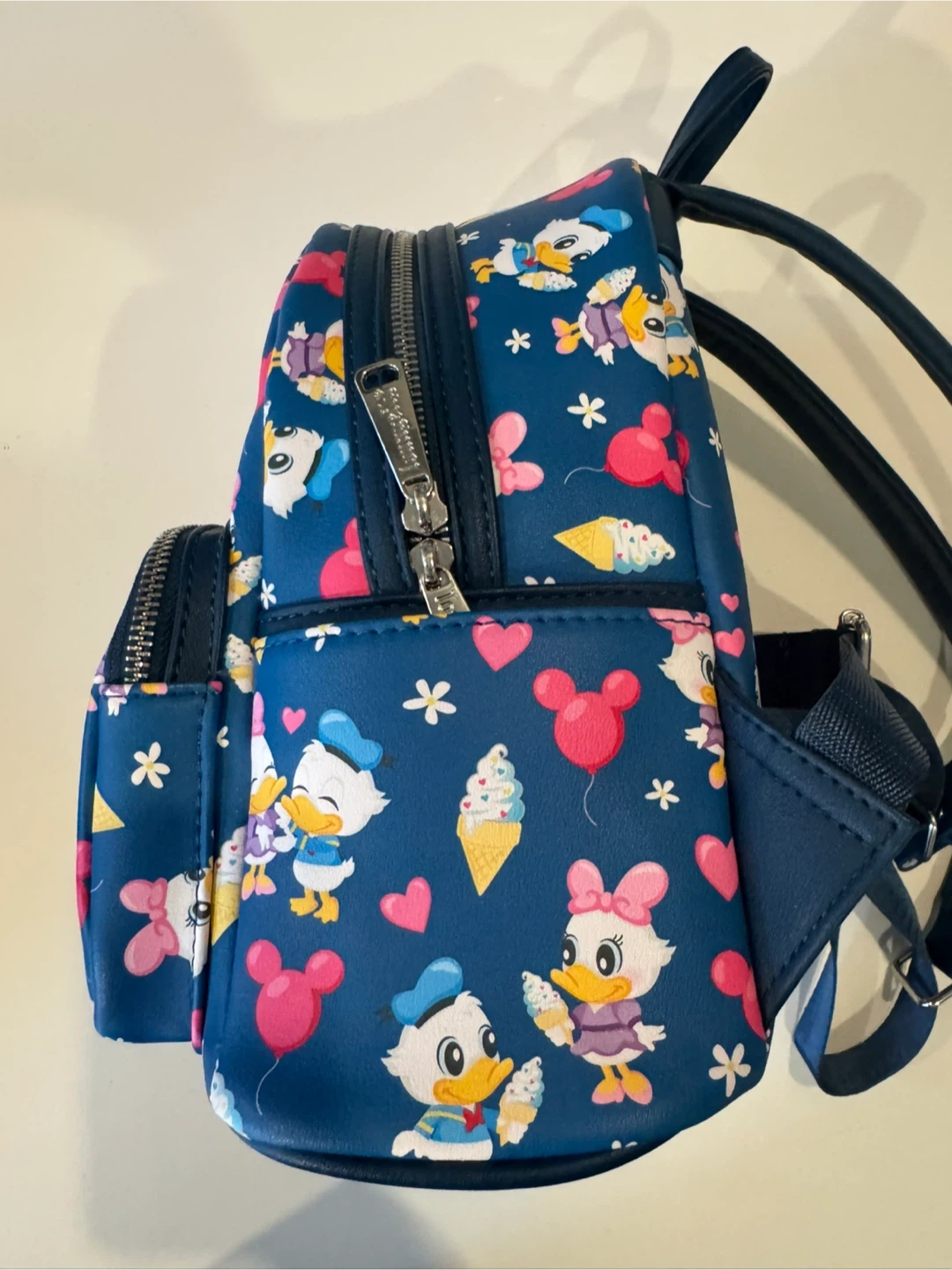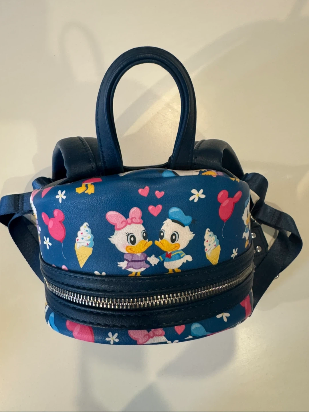 This Loungefly mini backpack features a fun print of Daisy and Donald Duck with ice cream and balloons. It's made of faux leather with adjustable straps and a zippered main compartment. Perfect for Disney fans!
