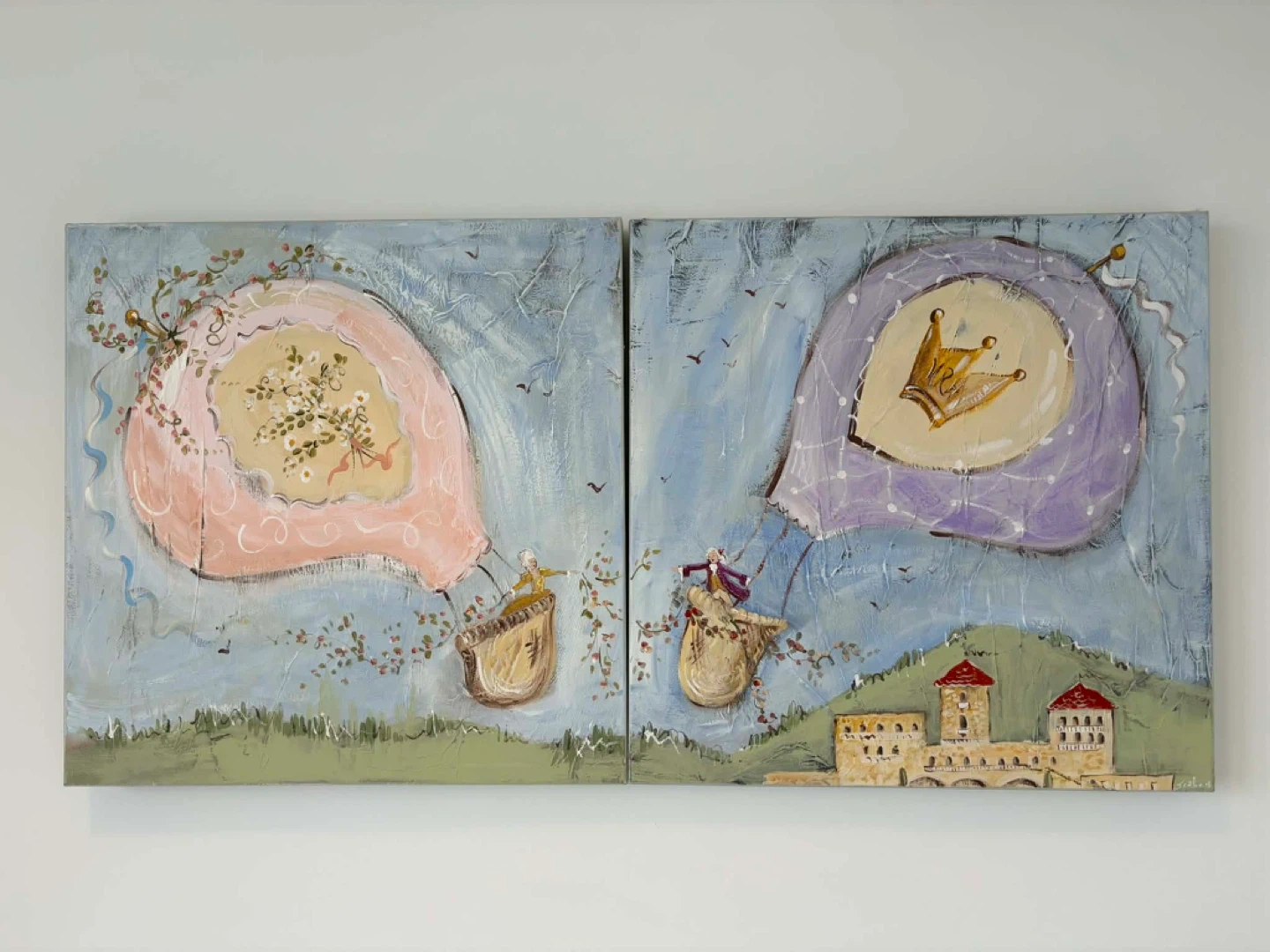 Two canvas art pieces depicting hot air balloons with a castle in the background. One balloon features a floral design, and the other has a golden crown. These are hand-painted.