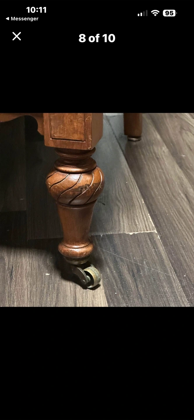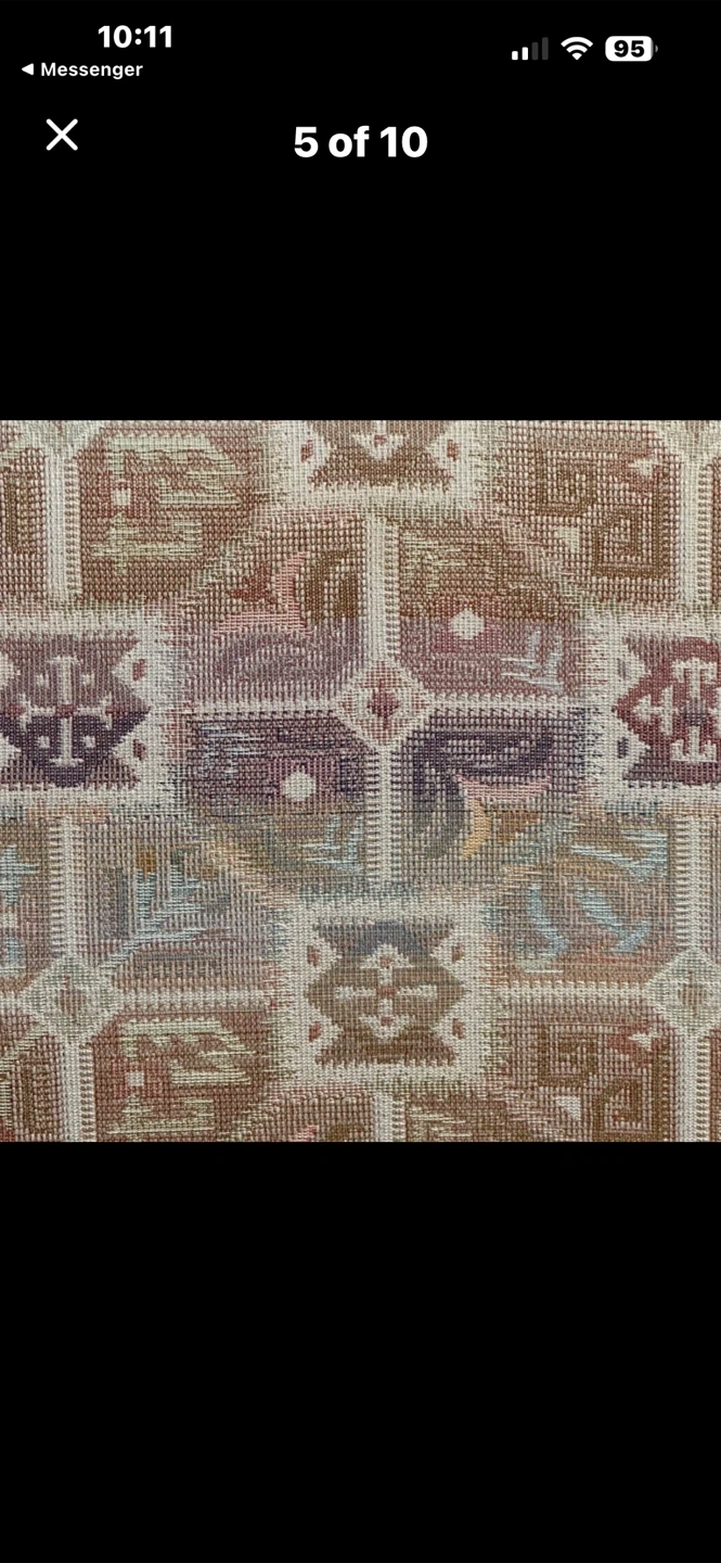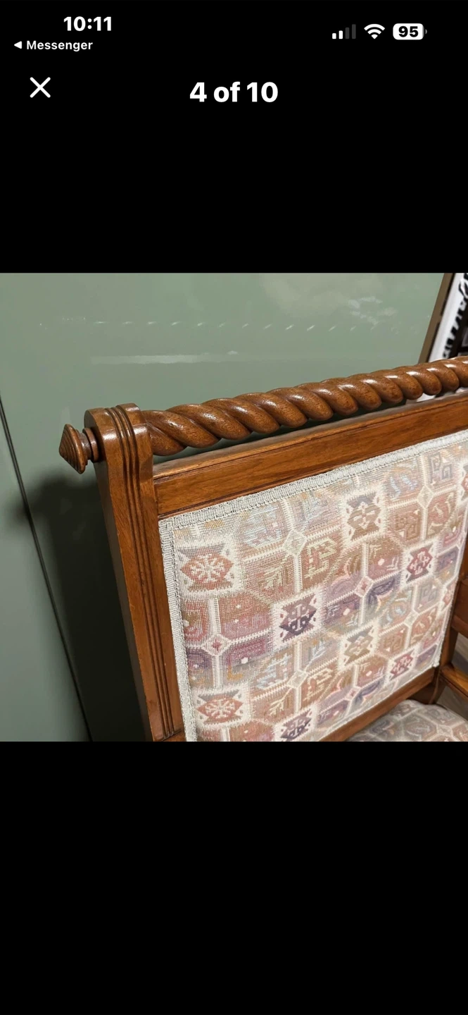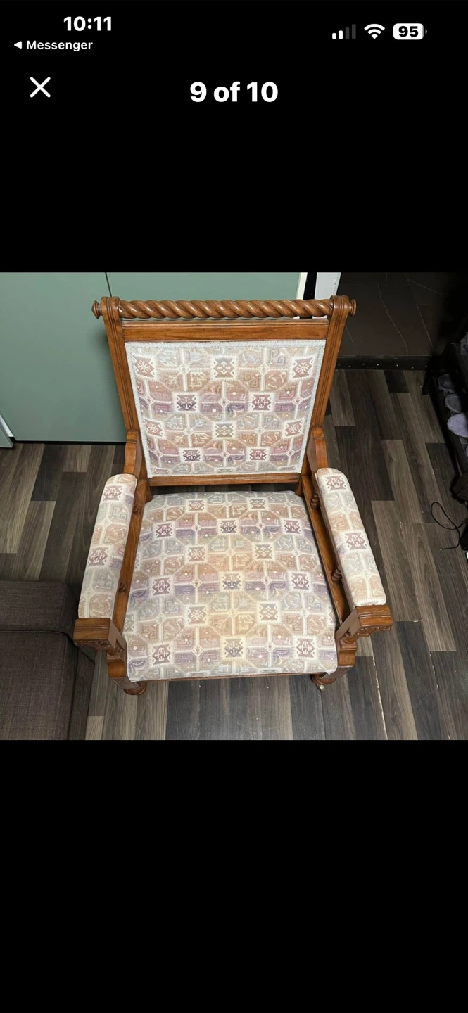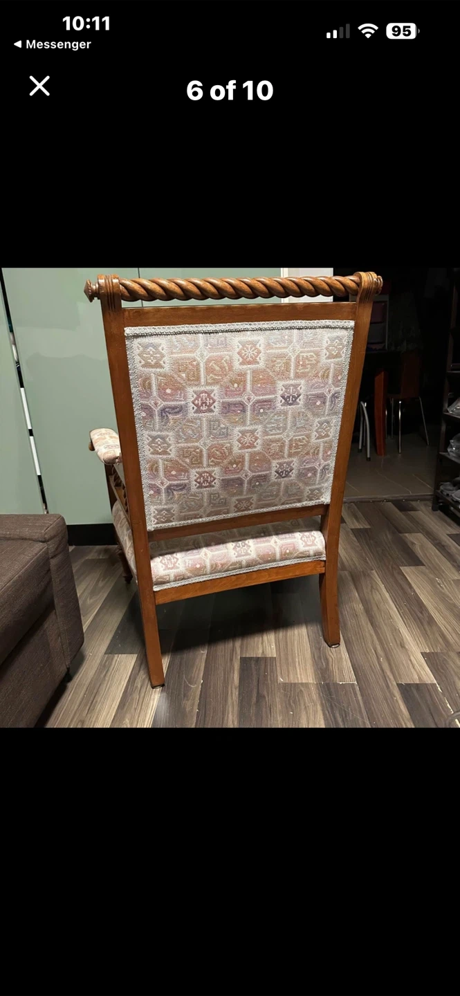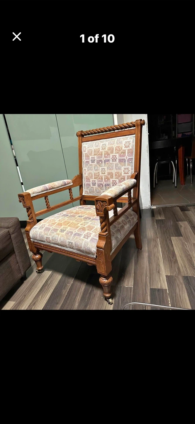 Wooden armchair featuring a vintage patterned upholstery on the seat and back. It has carved details on the arms and a twisted design on the frame. This chair is a lovely accent piece for any room.