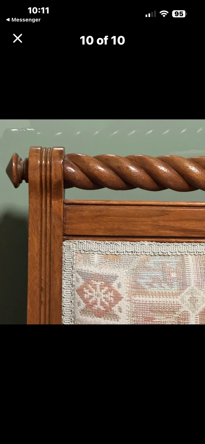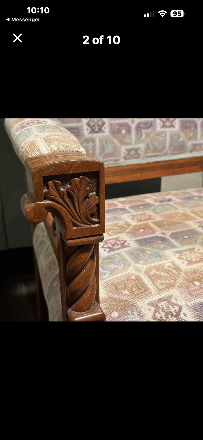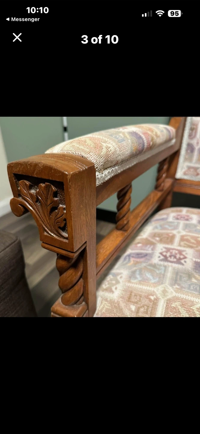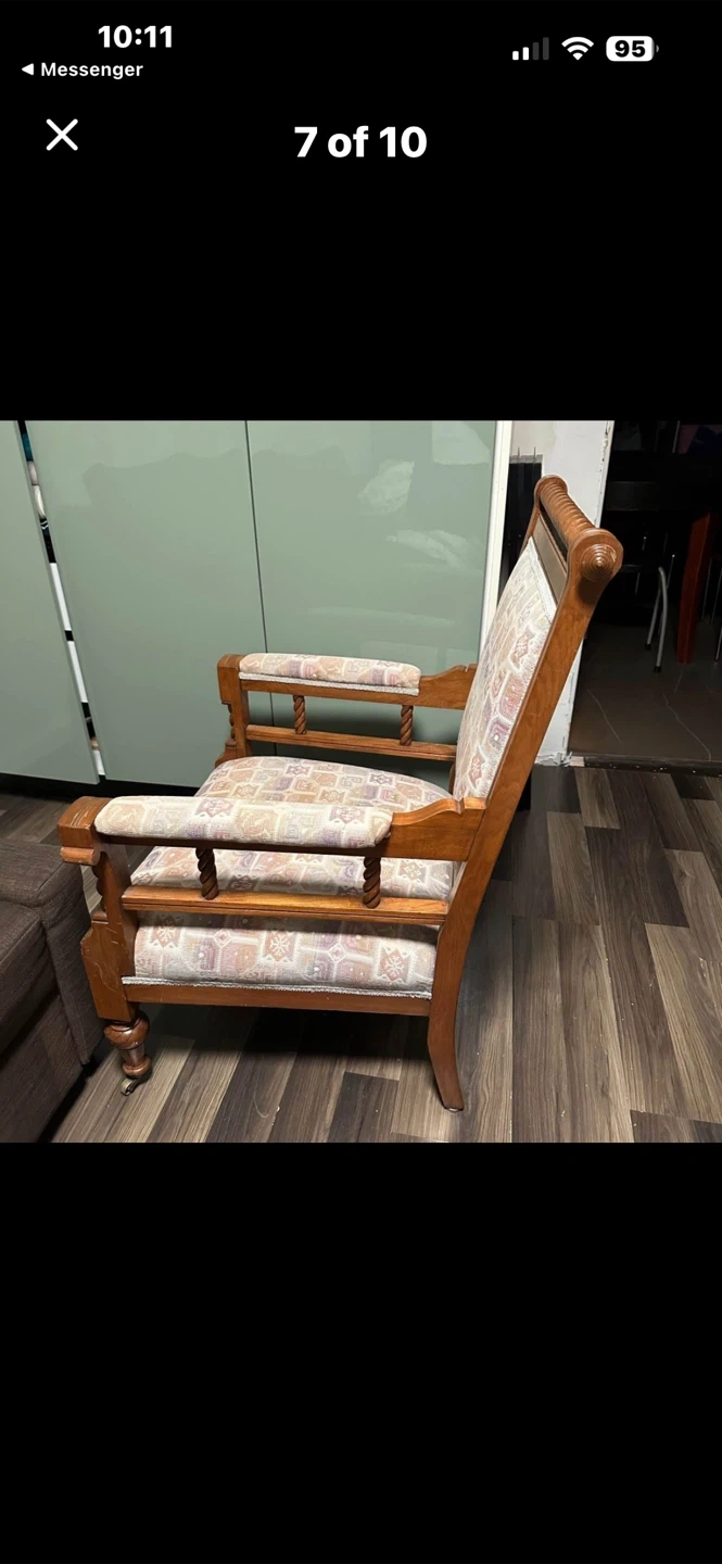 Wooden armchair featuring a vintage patterned upholstery on the seat and back. It has carved details on the arms and a twisted design on the frame. This chair is a lovely accent piece for any room.