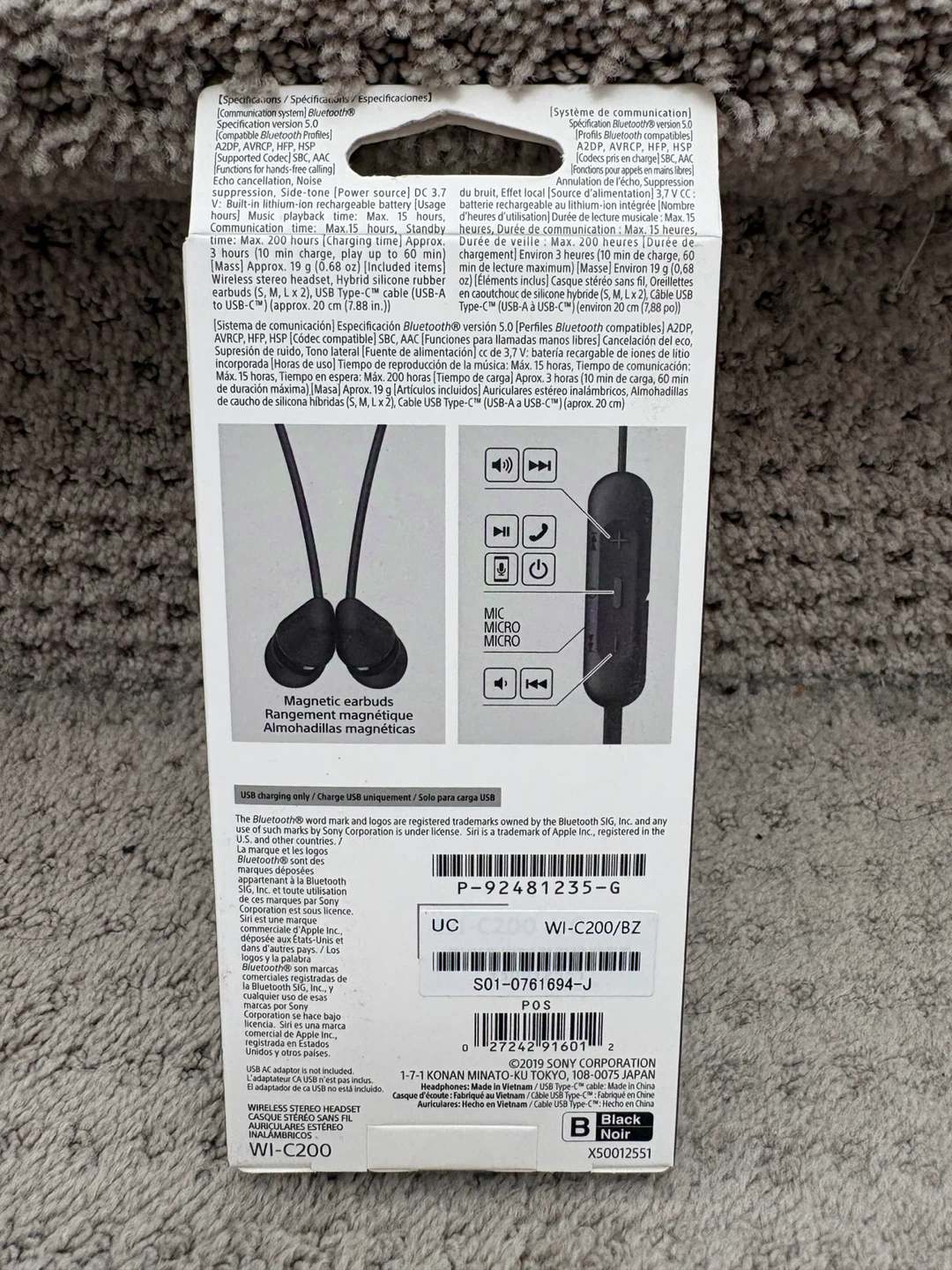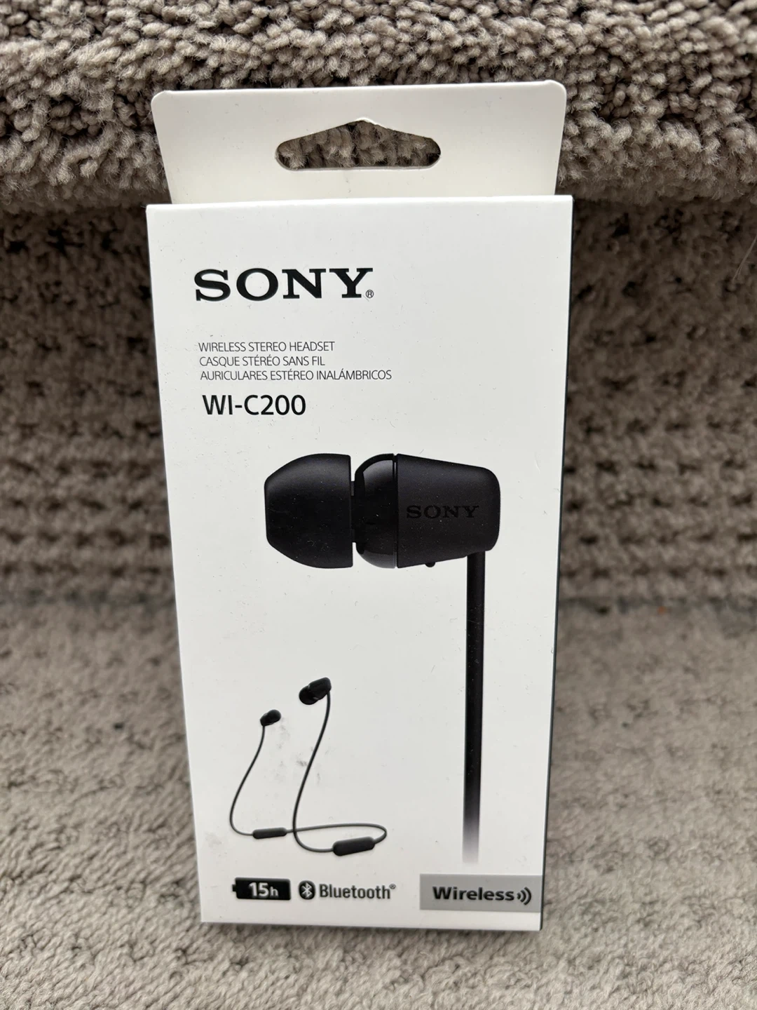 Sony WI-C200 wireless stereo headset. Features magnetic earbuds and up to 15 hours of battery life. Includes USB-C charging cable. It's black and comes with a USB-C charging port.