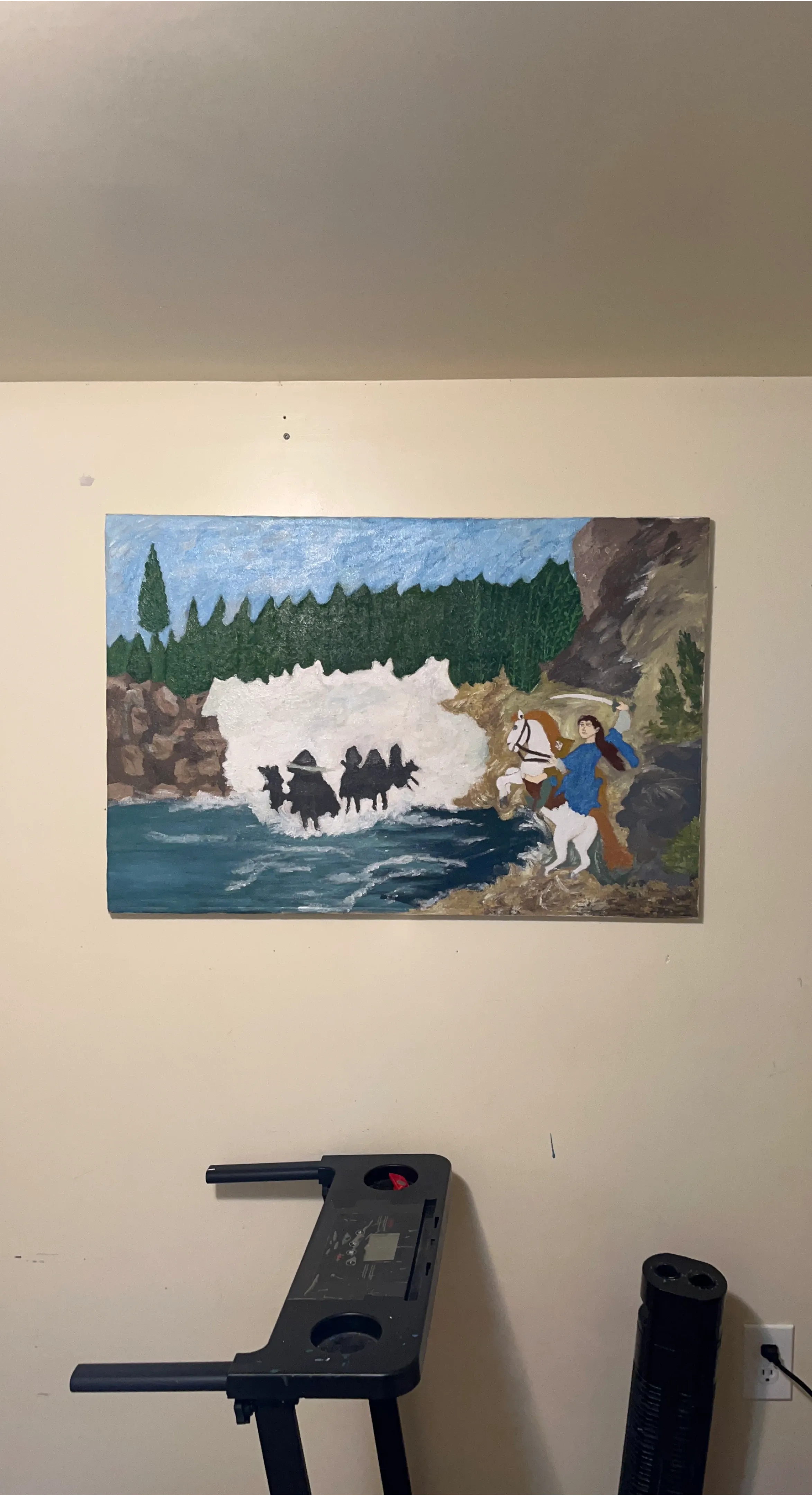 This is an original acrylic painting depicting a woman on a horse, leading a caravan through a scenic landscape. The artwork features a river, forest, and rocky cliffs. It's a unique piece for home decor.
