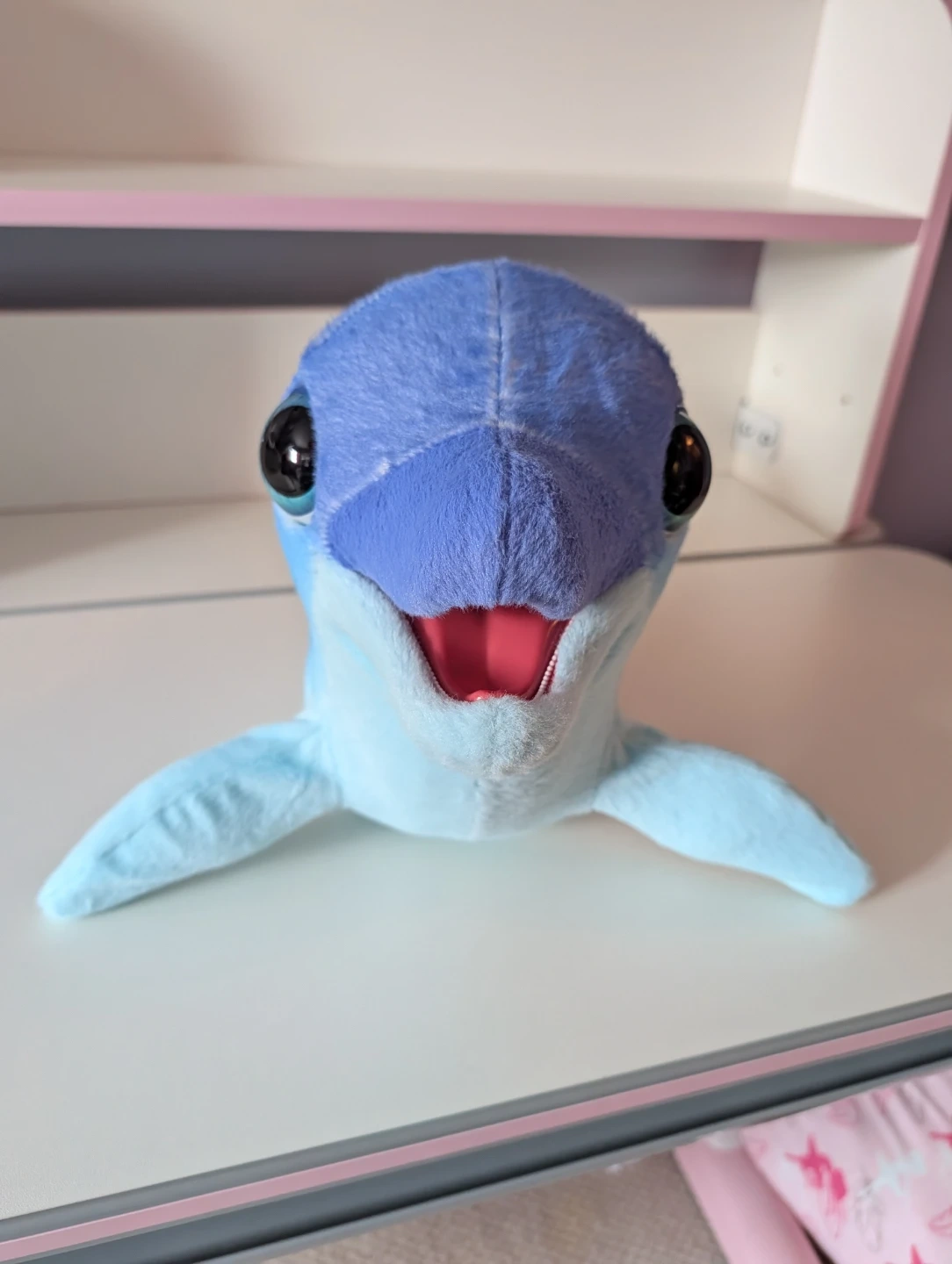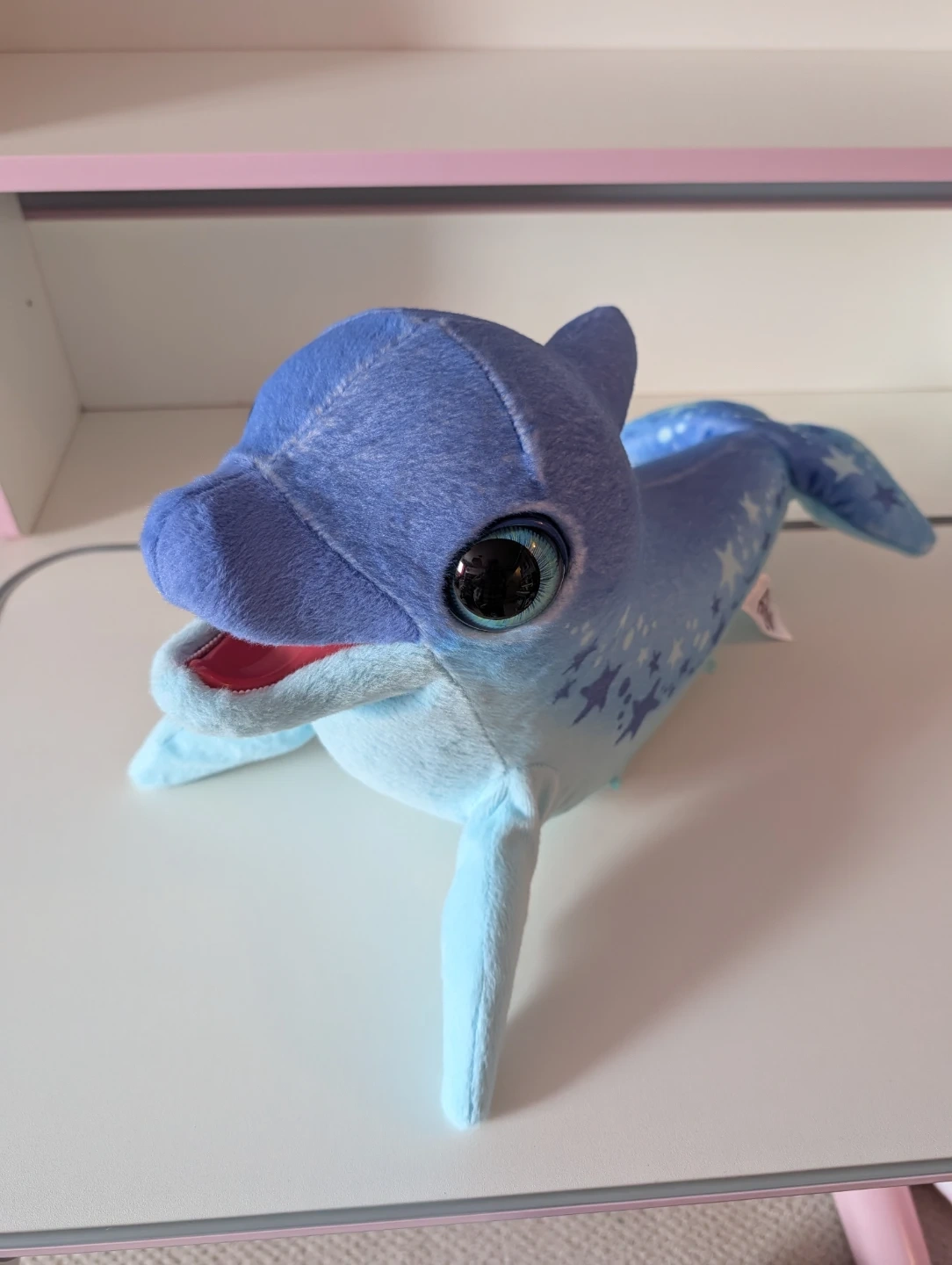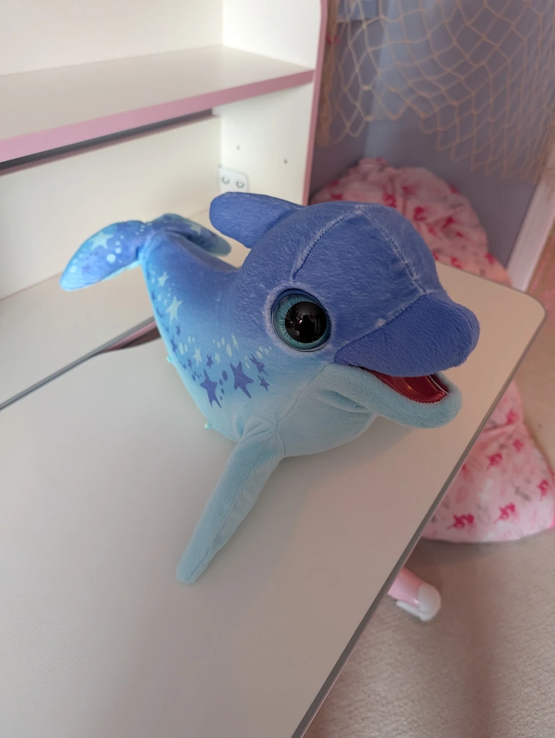This is a FurReal Friends plush dolphin toy. It's blue with white stars all over its body and tail. Press the button on its fin to see the dolphin move and make sounds. A button on the underside can switch to soothing music, helping your little one fall asleep.