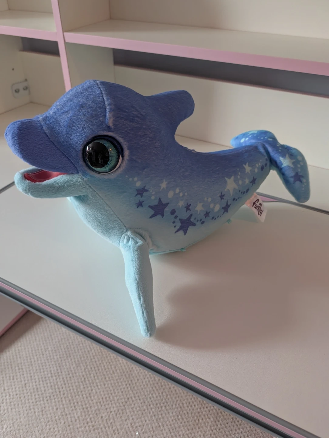 This is a FurReal Friends plush dolphin toy. It's blue with white stars all over its body and tail. Press the button on its fin to see the dolphin move and make sounds. A button on the underside can switch to soothing music, helping your little one fall asleep.
