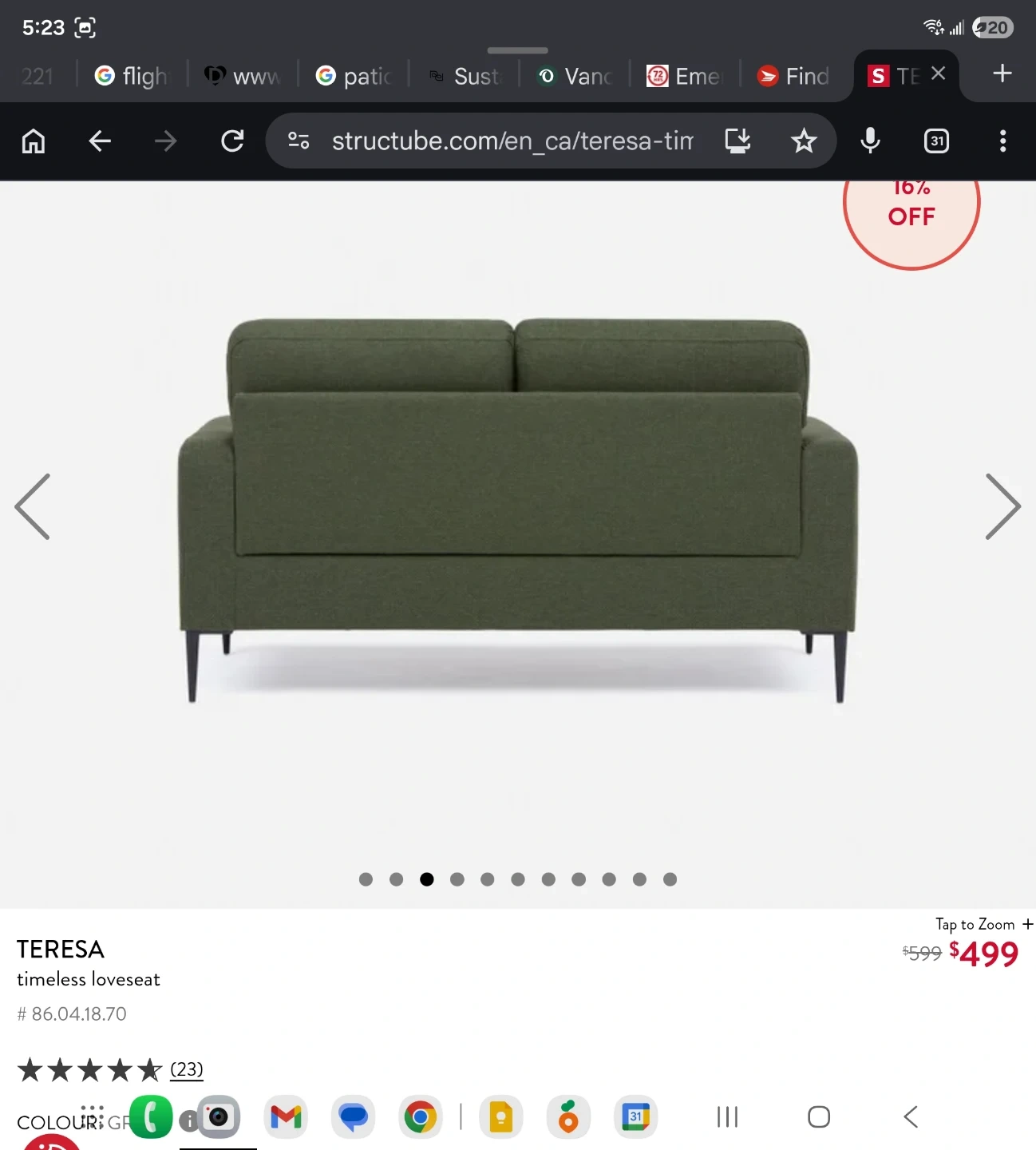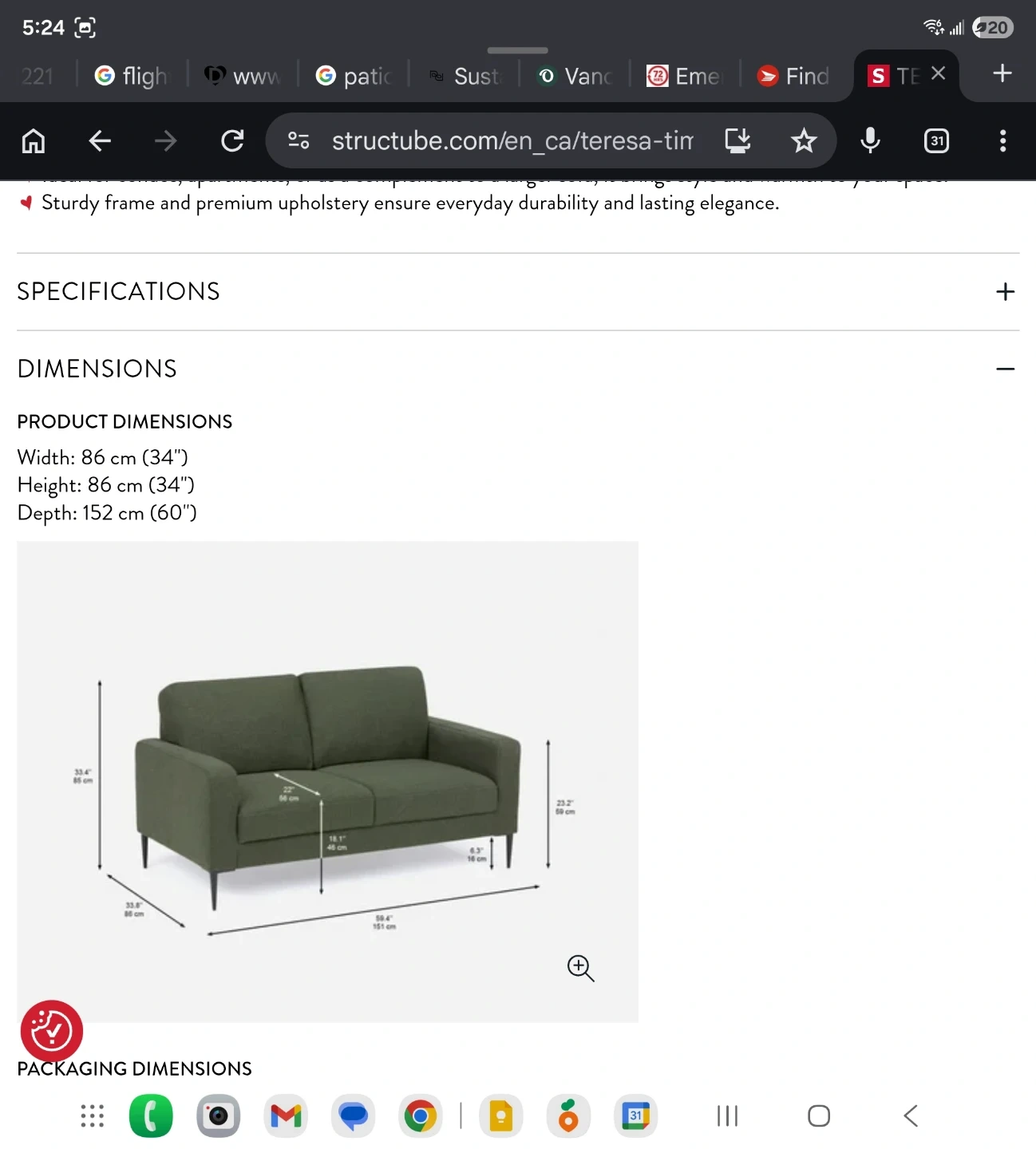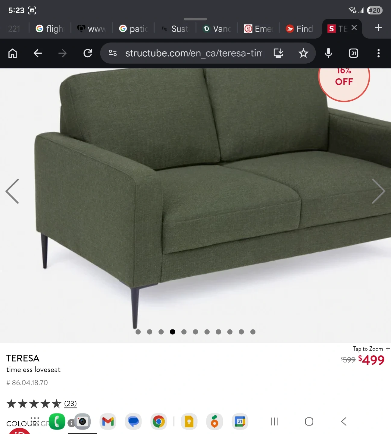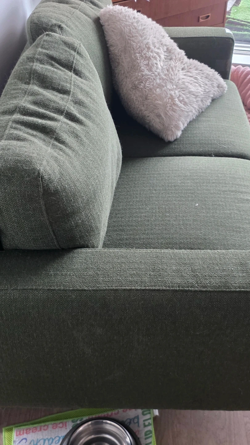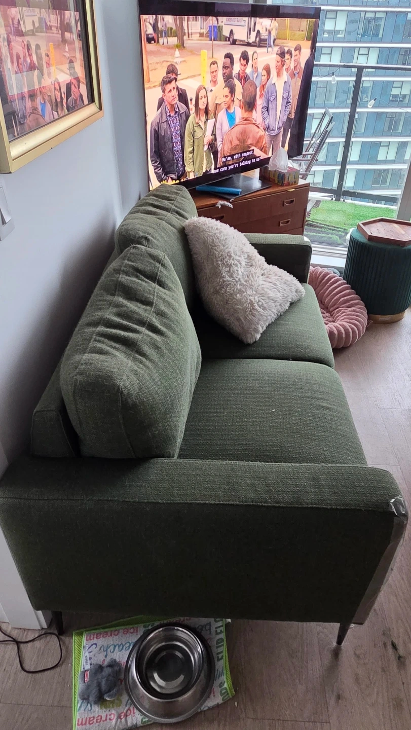 Structube TERESA timeless loveseat in a deep green colour. Width is 86 cm (34"), height is 86 cm (34"), and depth is 152 cm (60"). Sturdy frame and premium upholstery ensure everyday durability and lasting elegance. 1 year old but one arm (see image) is a little stratched and worn as it was covered with scratch prevent tape after the fact. No other damage. Smoke-free home. (But I do have a cat- if you have allergies). The back can be removed for travel. Retails for $500. Moving to smaller place.