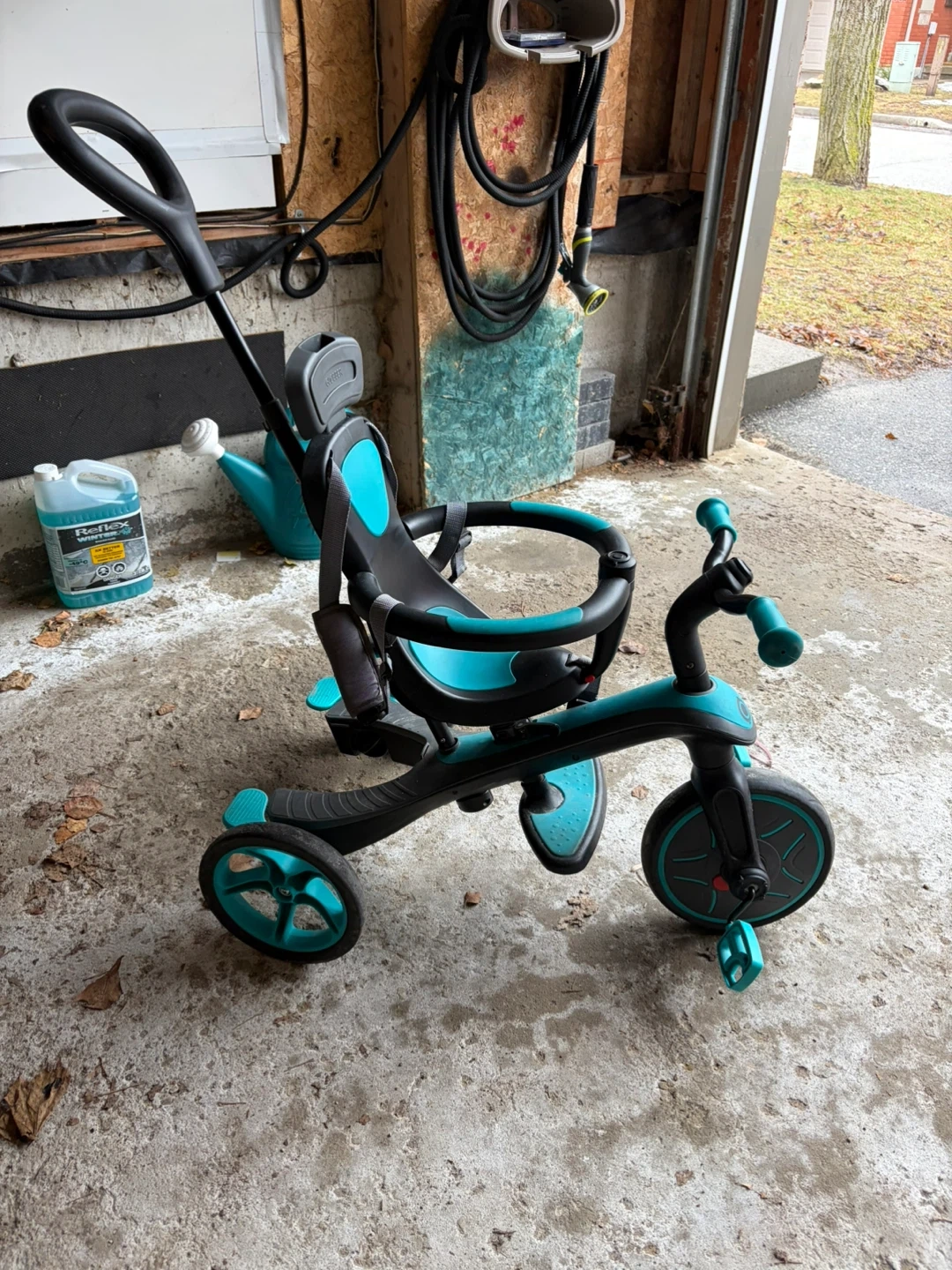 This adaptable tricycle is designed for young children, featuring a comfortable seat with safety restraints and a parent push handle. It's a great way for little ones to enjoy outdoor adventures as they grow. The teal and black colours add a stylish touch.