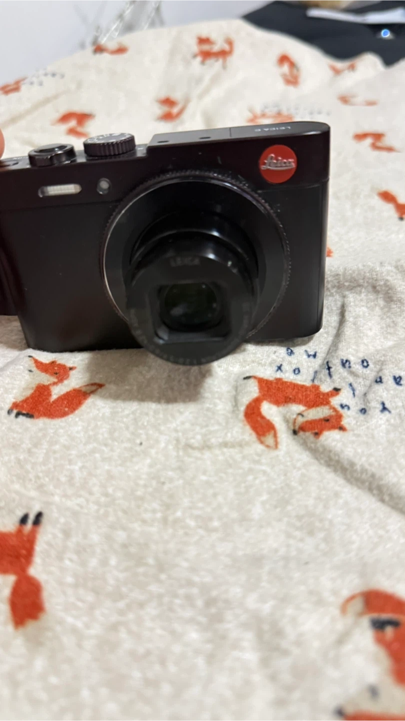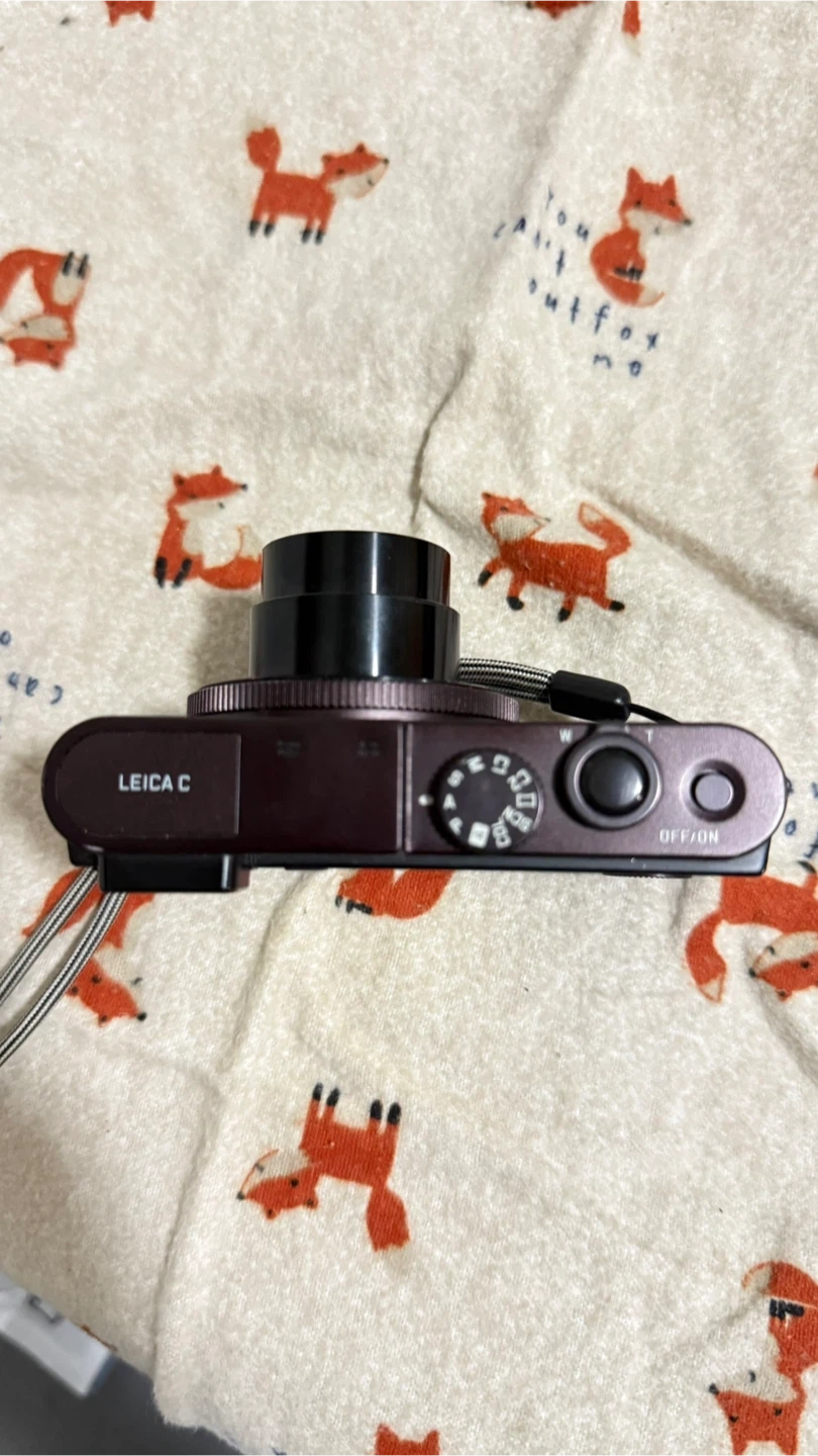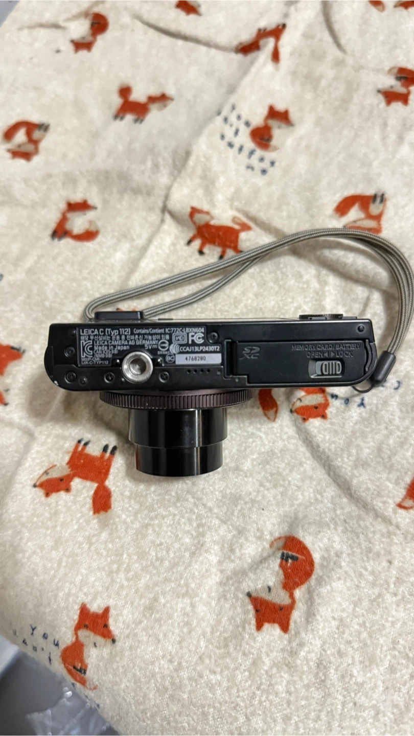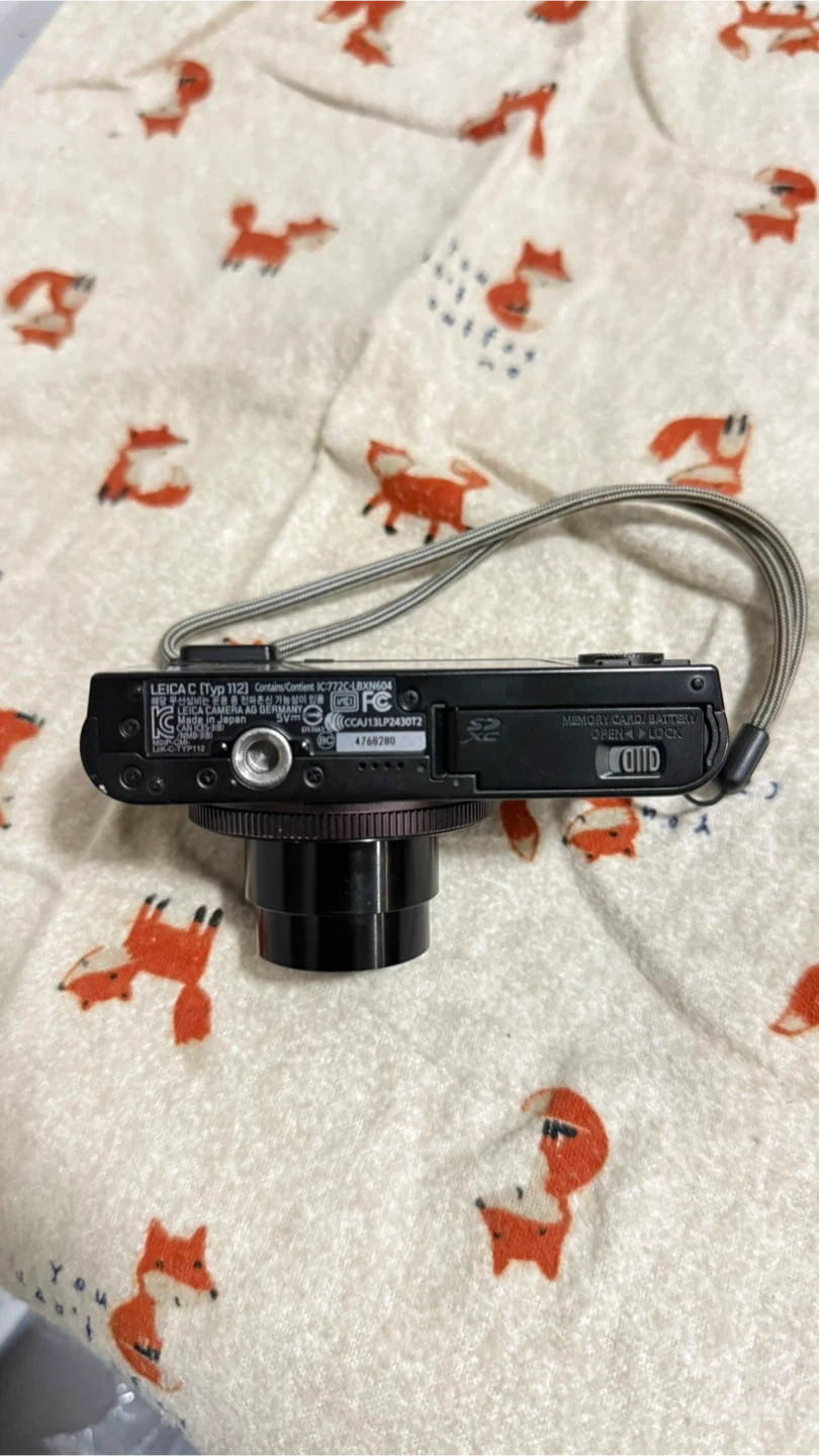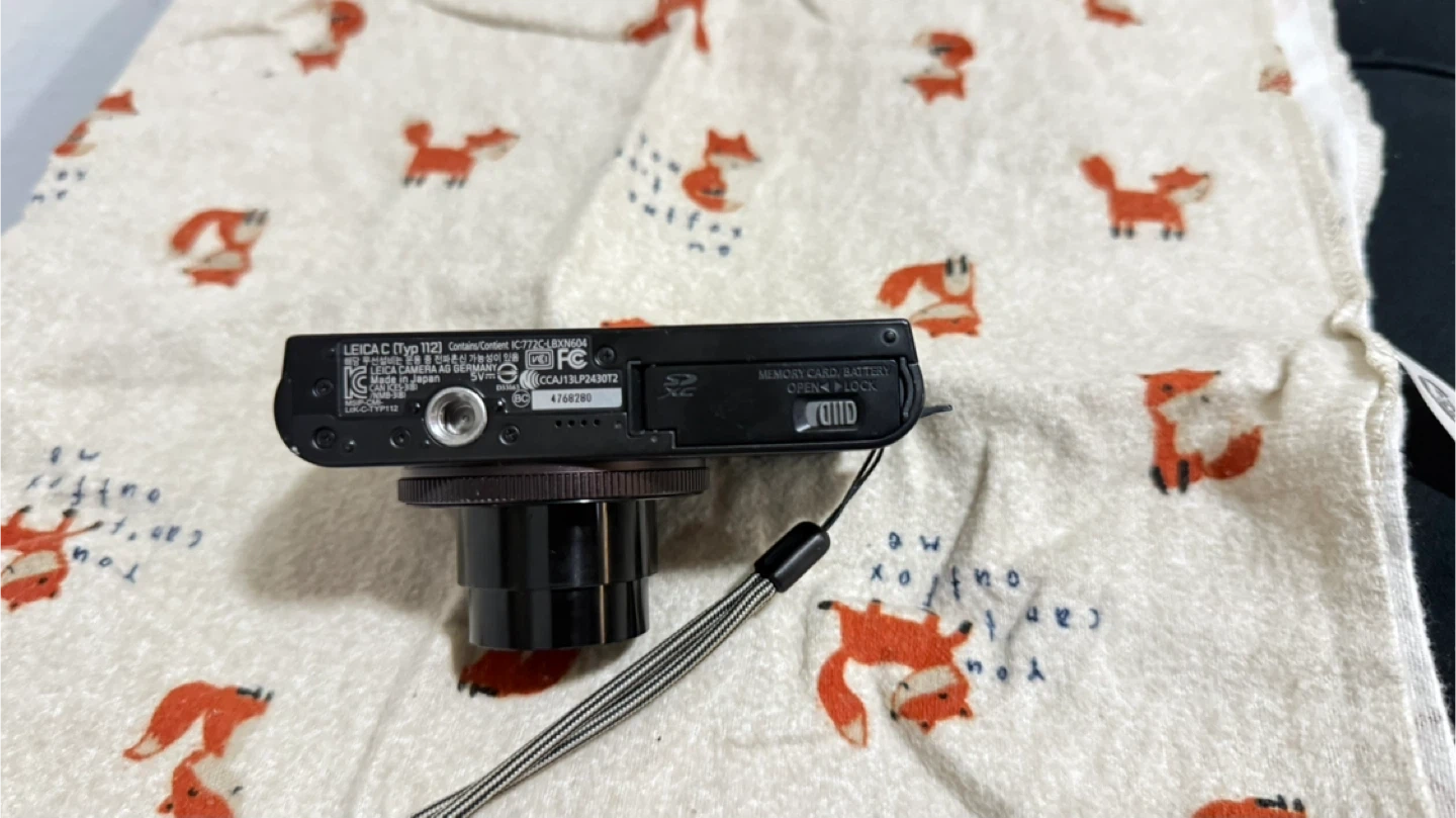 Leica C (Typ 112) digital camera. Compact point-and-shoot model. Includes a wrist strap for portability. Memory card and battery compartment is accessible.