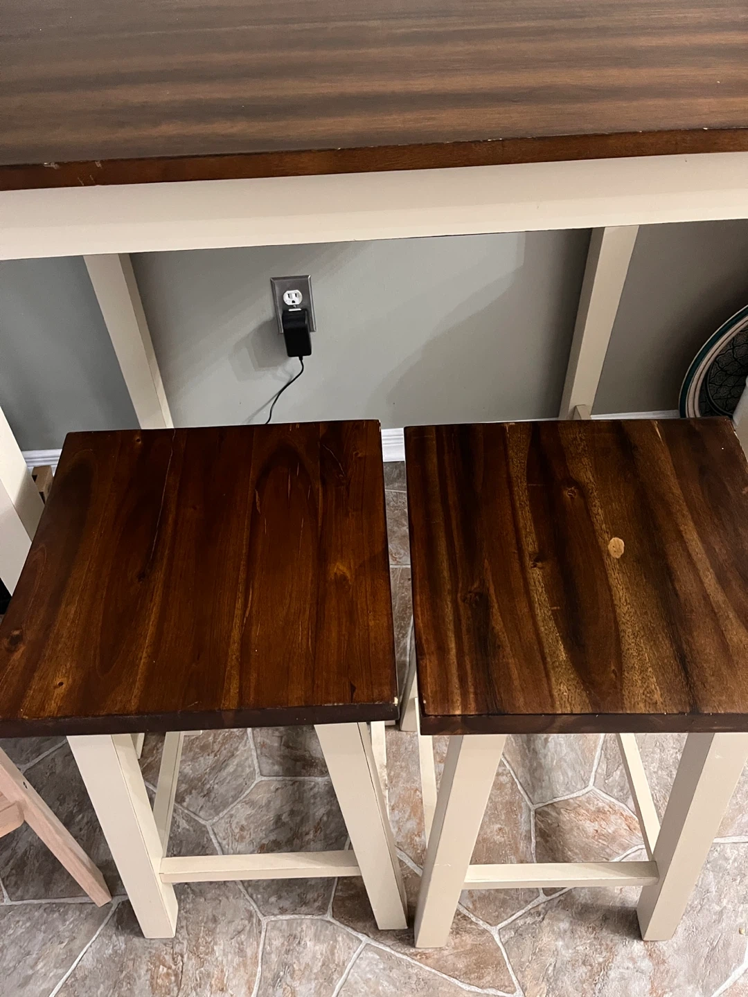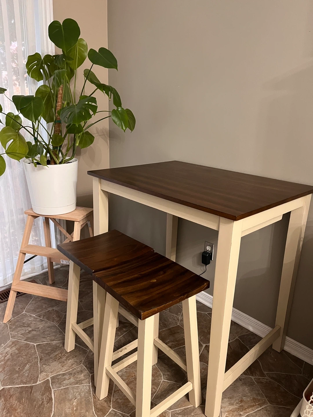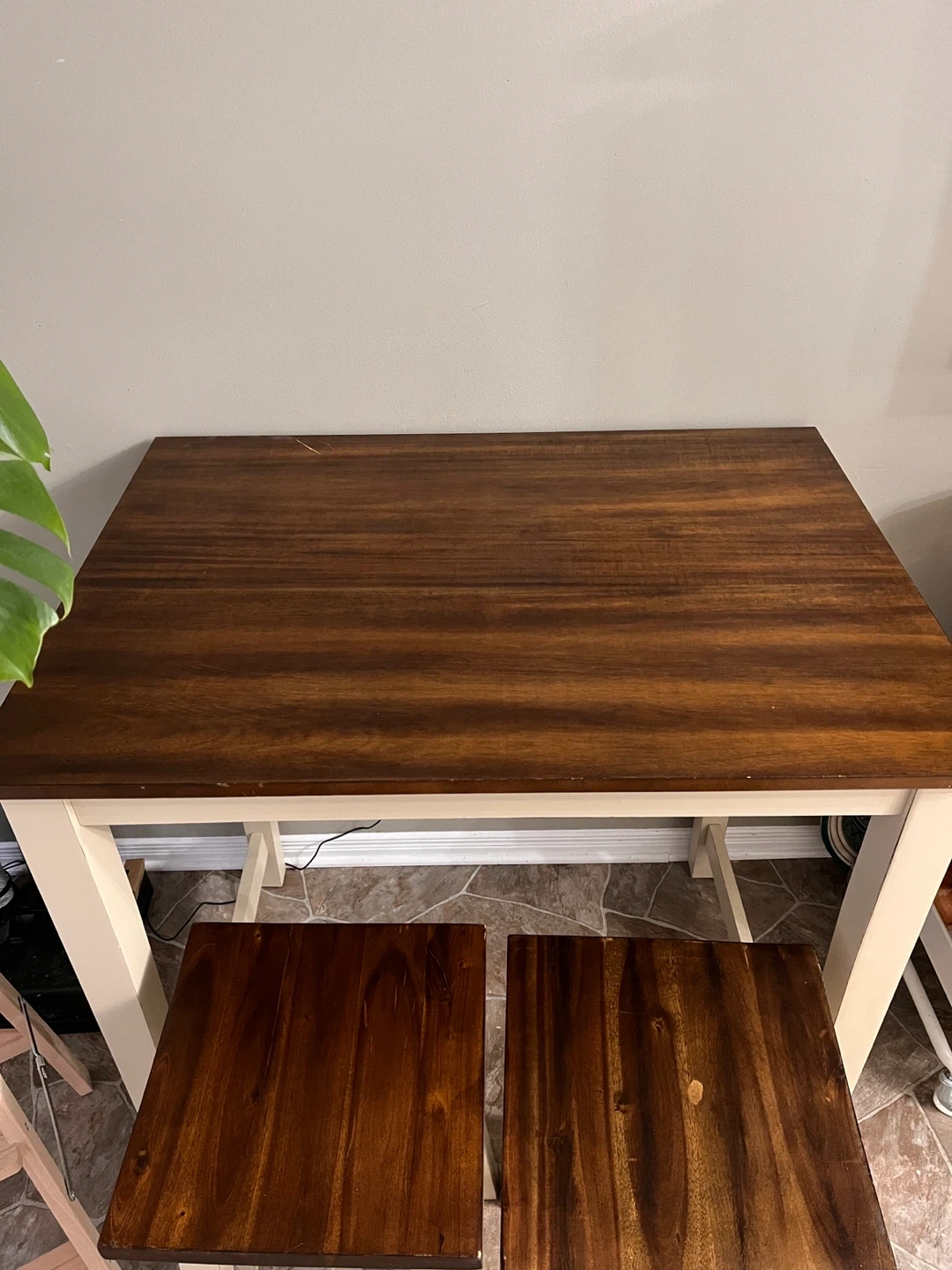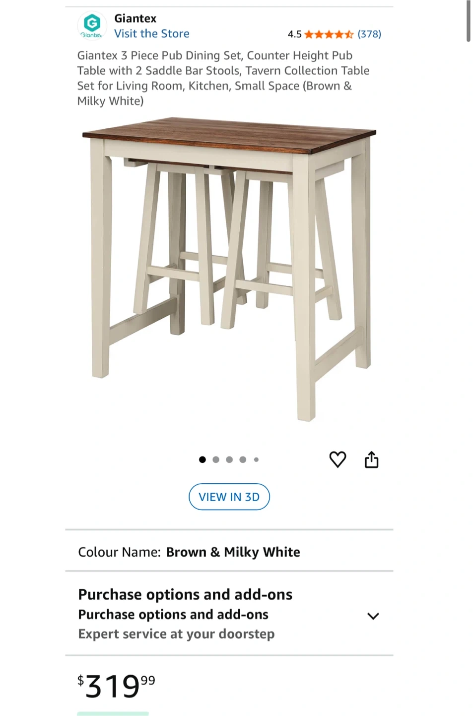 5Selling a Giantex 3-piece pub dining set! It's a counter height table with 2 saddle bar stools, perfect for a kitchen or small space. The colour is a lovely brown and milky white. Originally bought for $319.99