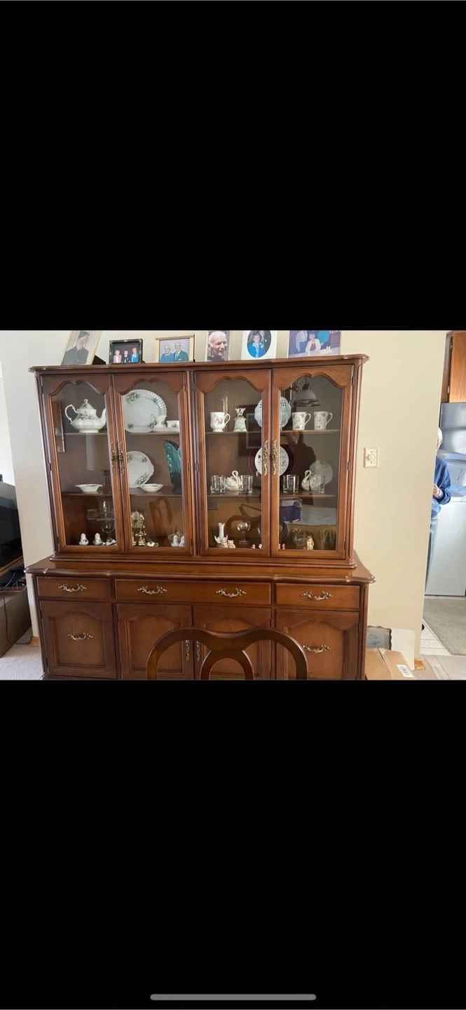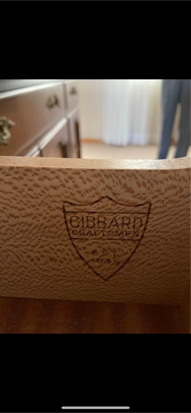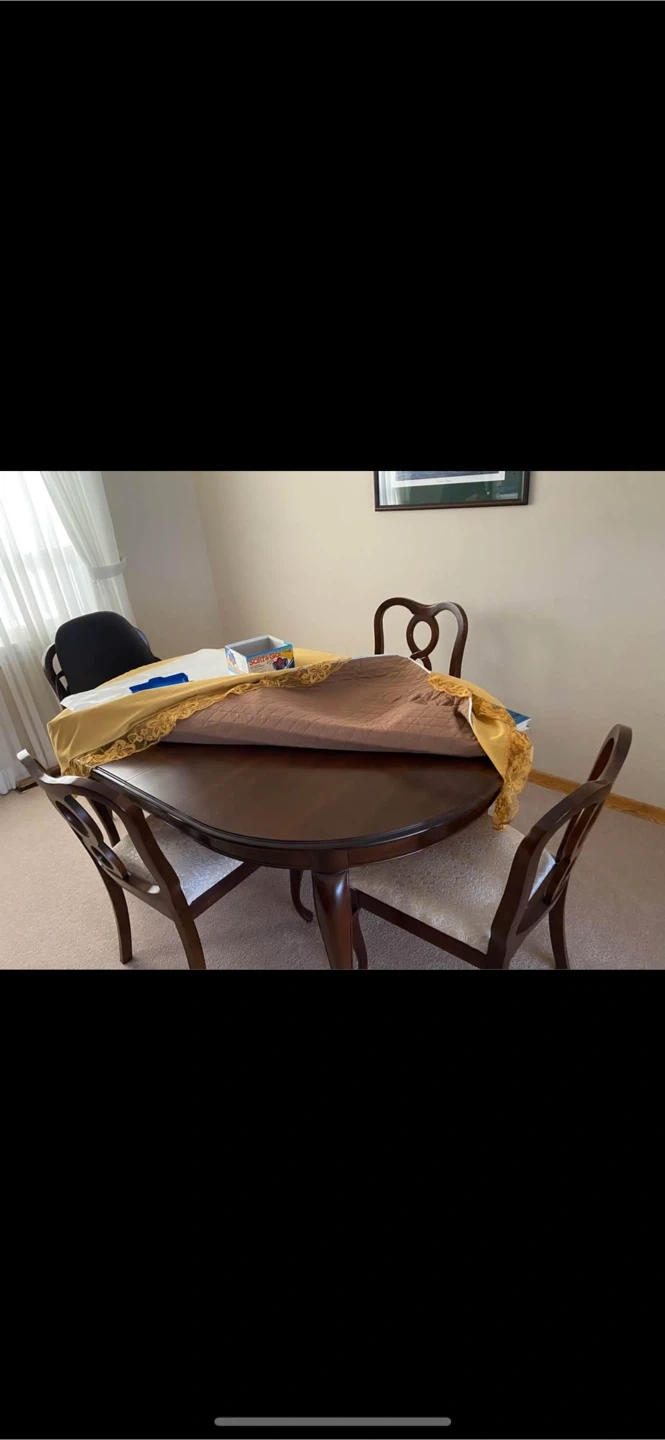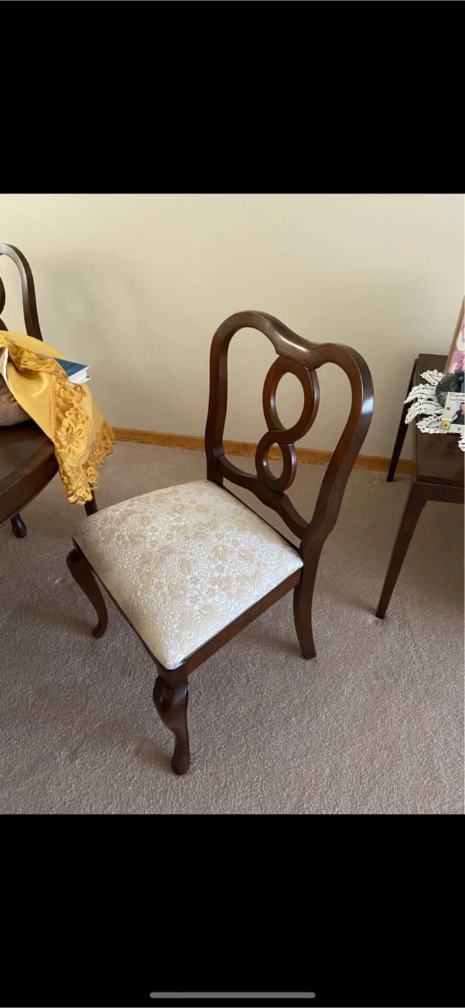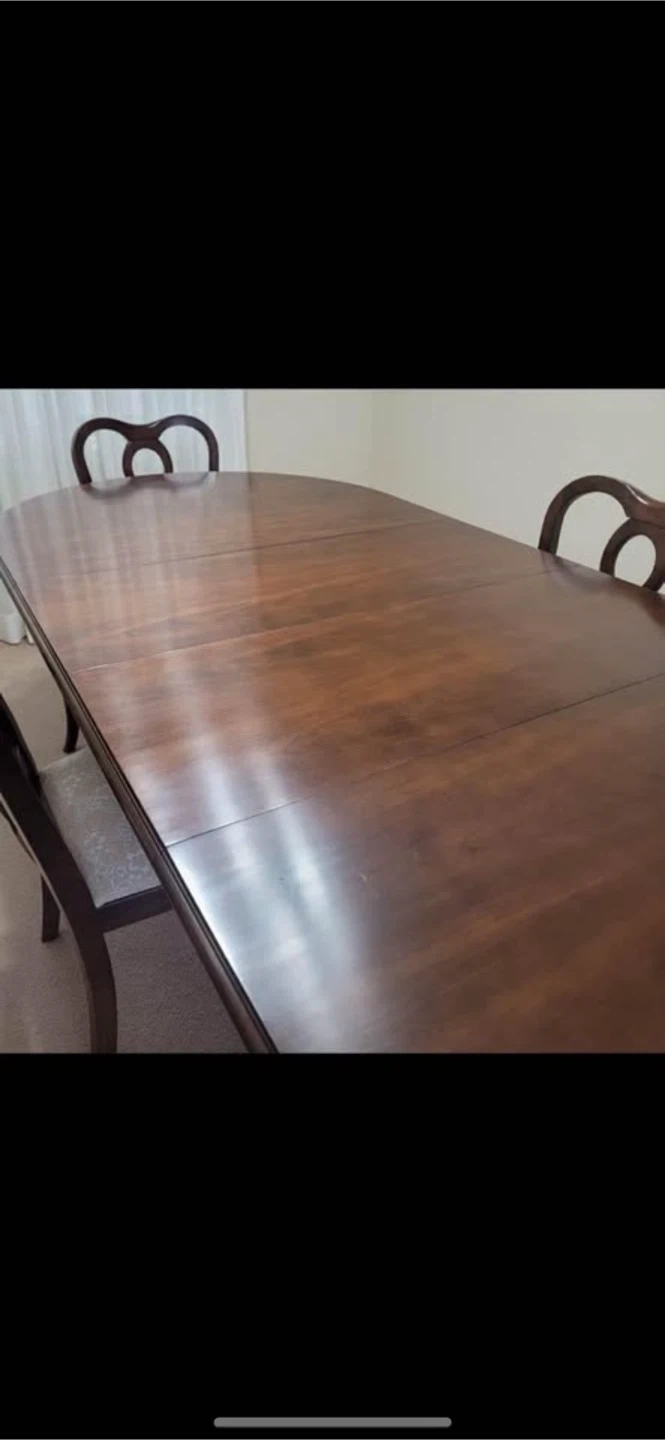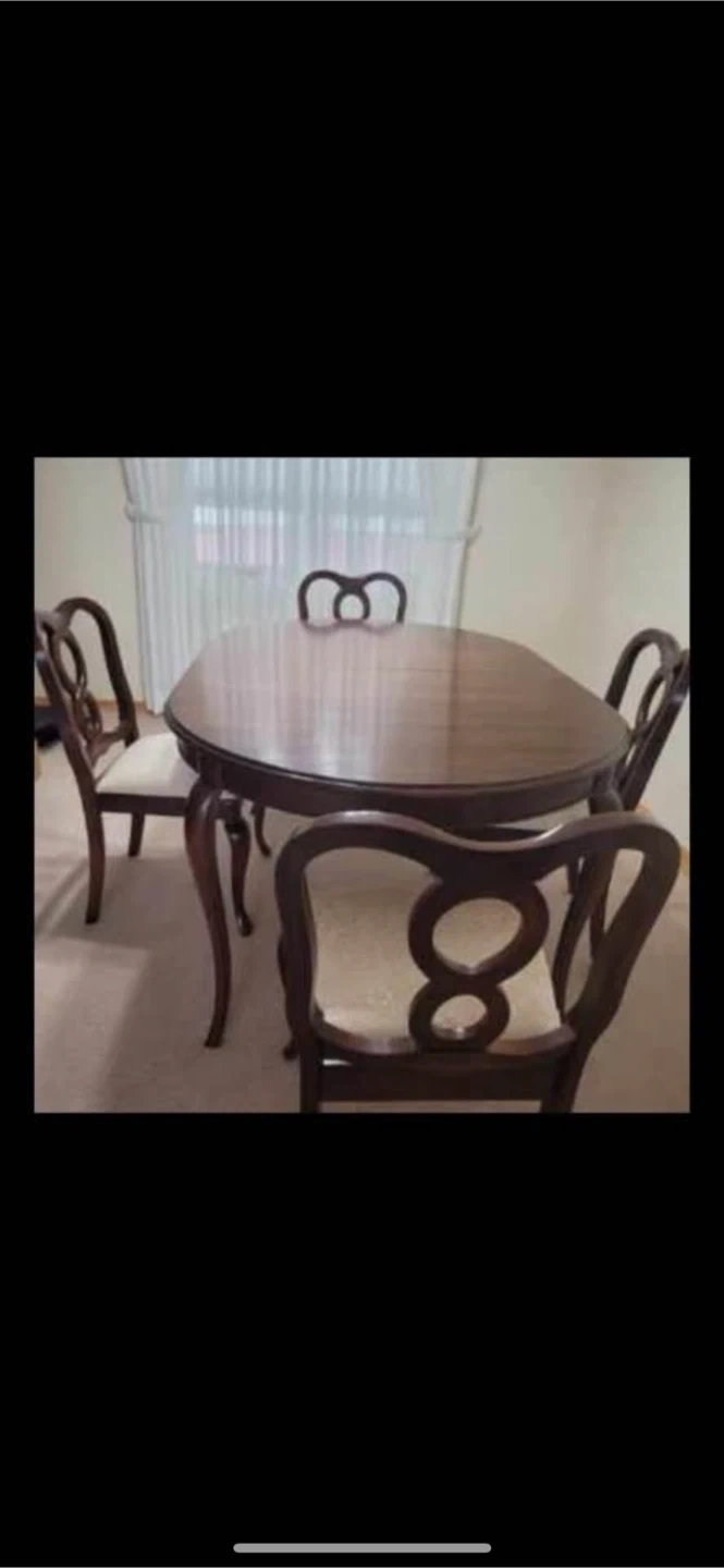 Selling a wooden dining table with four chairs. Chantilly collection French provincial dining room set genuine solid cherry large oval 42” 64” extends to 96” - buffet top 50”x15”x42” buffet 54”x20”x32” 4 chairs are 35” high The table has a lovely dark wood finish, and the chairs have a unique design on the back. Gibbard dining set with table extension and 4 chairs with padding - AMAZING CONDITION