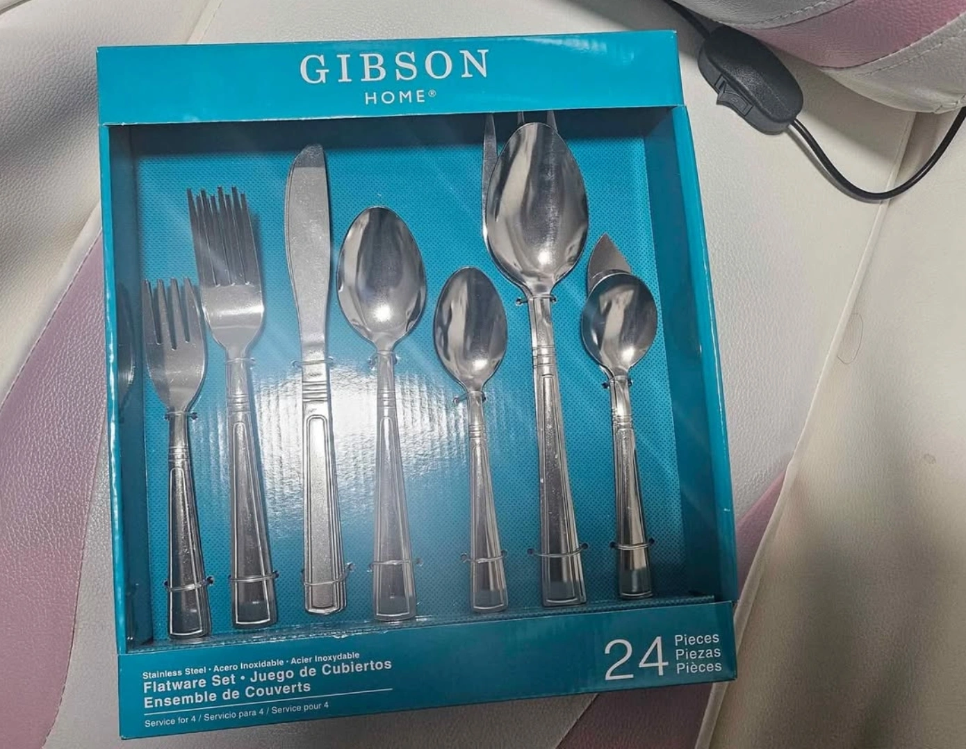 352New in box. 24-piece stainless steel flatware set. Service for four. Includes forks, knives, spoons, and teaspoons.