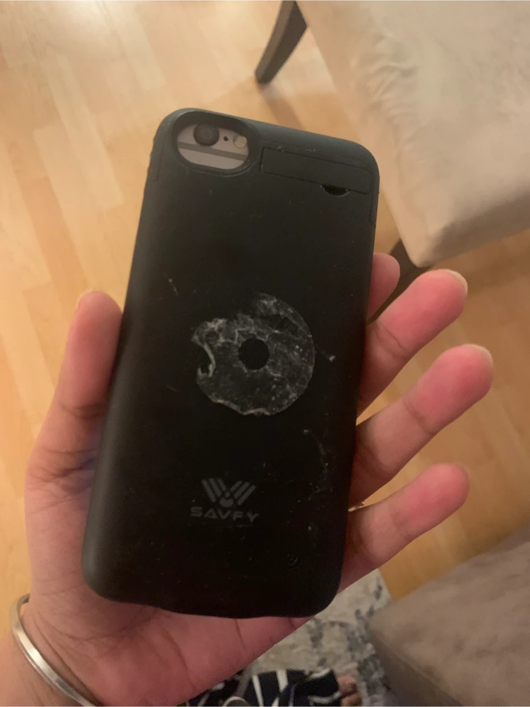 This is an Apple iPhone 6 in silver. It's a used phone with a black SAVFY phone case included. The phone case has some wear, and a circular sticker residue on the back.