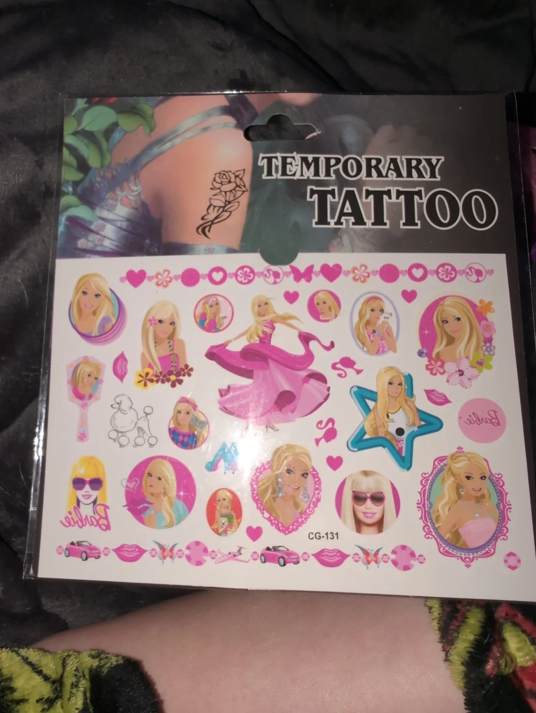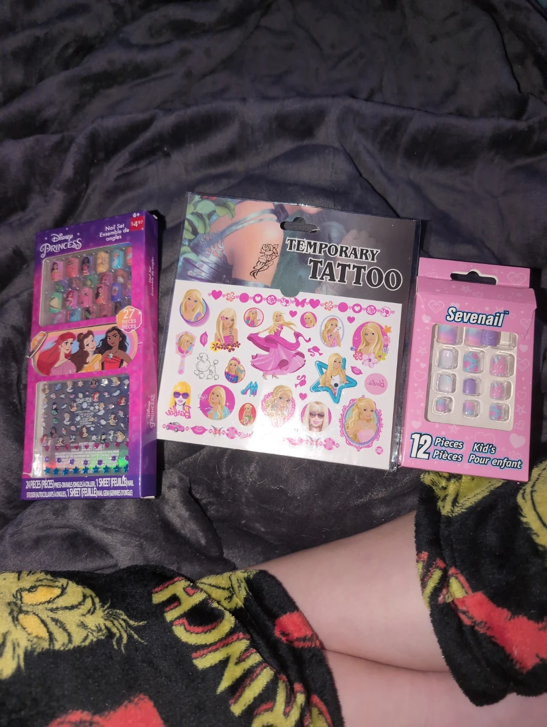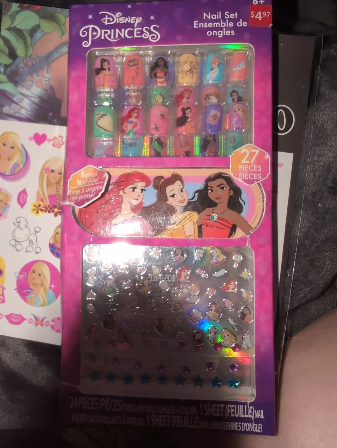 This Disney Princess nail set comes with 27 pieces and includes nail stickers and gems. There's also a bonus sheet of nail files included. It's for ages 6+ and has a $4.97 price tag on it. Also included is a sheet of Barbie temporary tattoos.