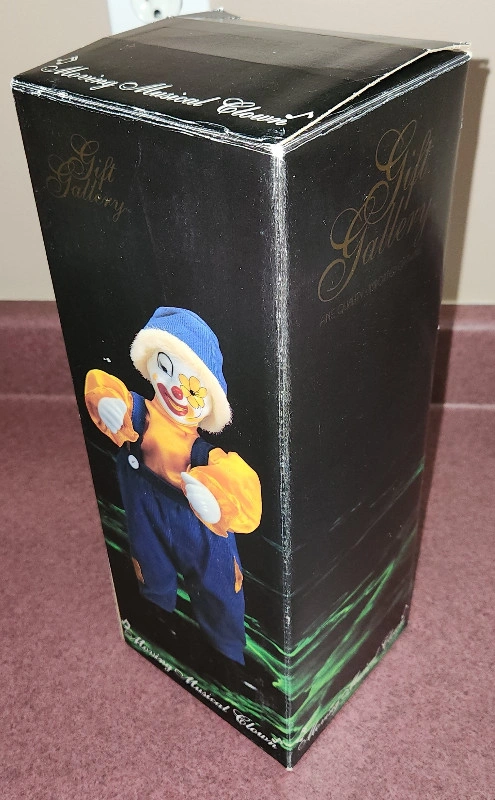 Gift Gallery (Animated) Moving Musical Clown, Vintage New in original box - Has built-in wind-up music box - Plays the song "Feelings" - Motion is it upper body moves/rocks slightly side to side - Hand-crafted porcelain face, feet and hands - Meticulously hand-painted face & shoes - Face & feet individually wrapped in bubble wrap, entire clown wrapped in bubble wrap - Approximately 12.5" tall, by 6" wide (31.75cm x 15.25cm) Asking $40.00