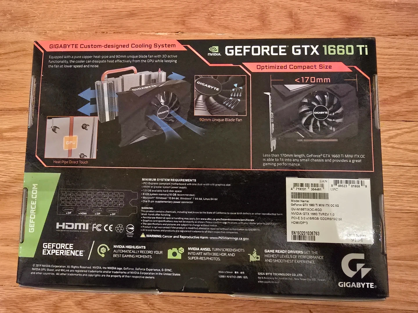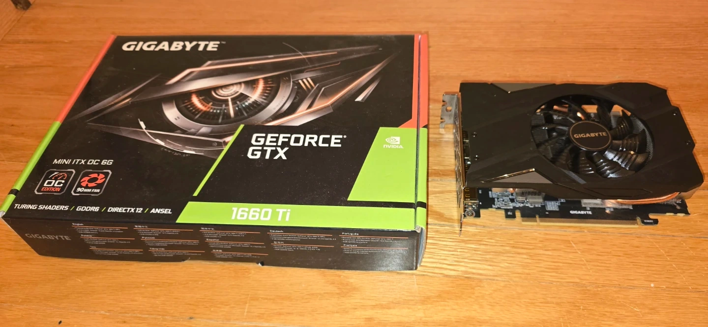 13Selling a Gigabyte GeForce GTX 1660 Ti Mini ITX OC 6G graphics card. It comes with the original box. This compact size card is less than 170mm in length, making it ideal for small form factor builds. It features a custom-designed cooling system with a pure copper heat-pipe and 90mm unique blade fan to dissipate heat effectively. Definitely a great choice for gaming!